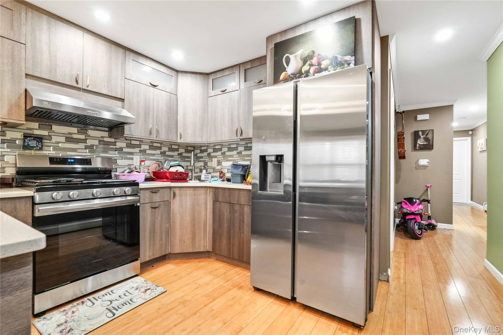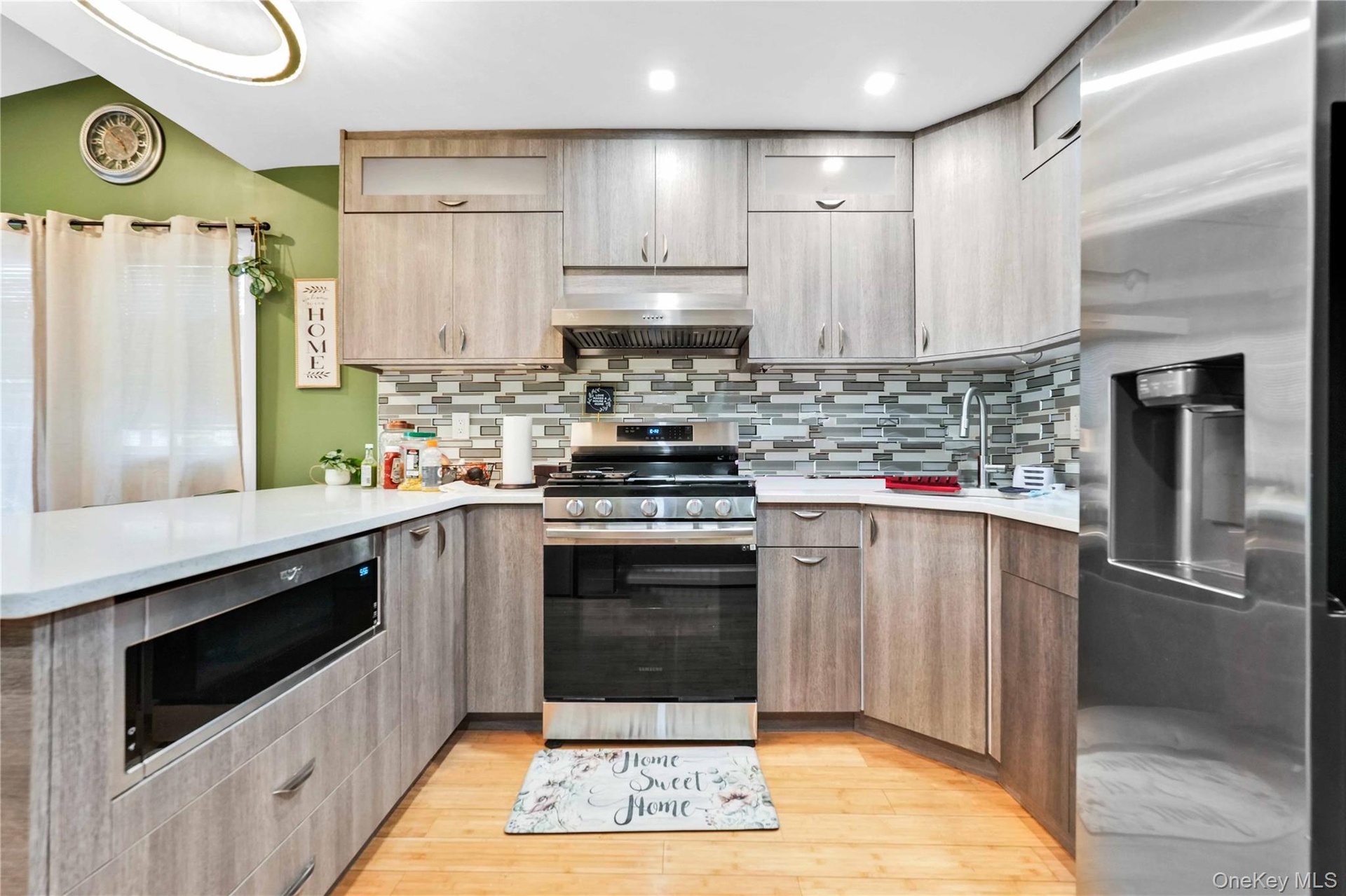 - Kitchen with stainless steel appliances, backsplash, under cabinet range hood, glass insert cabinets, and light wood-style floors