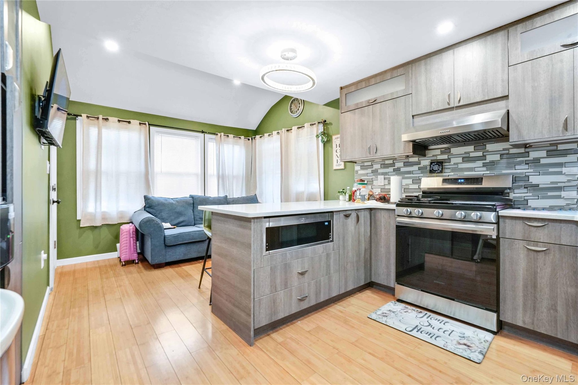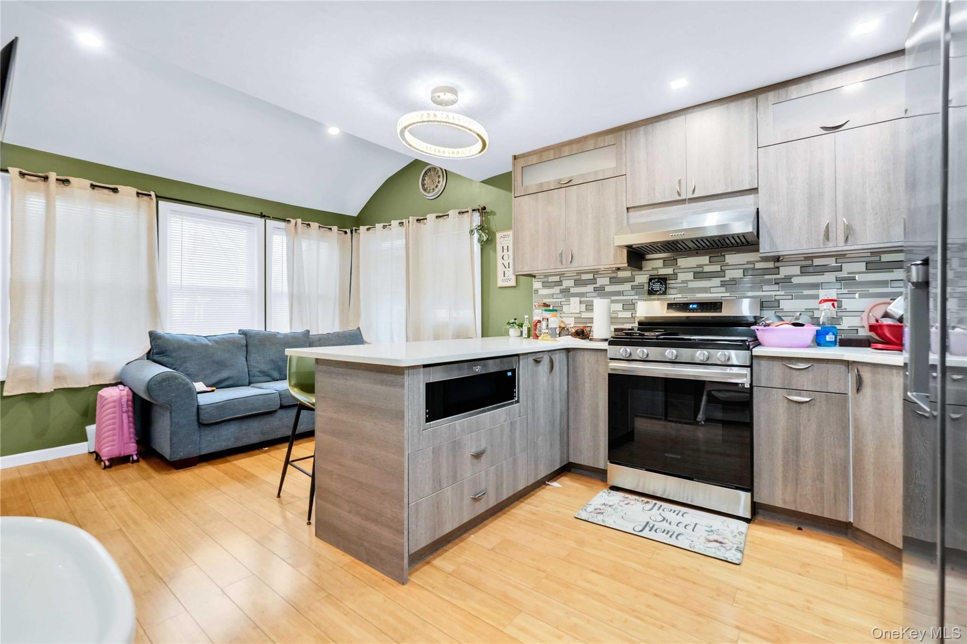 - Kitchen with appliances with stainless steel finishes, backsplash, light wood finished floors, a peninsula, and under cabinet range hood