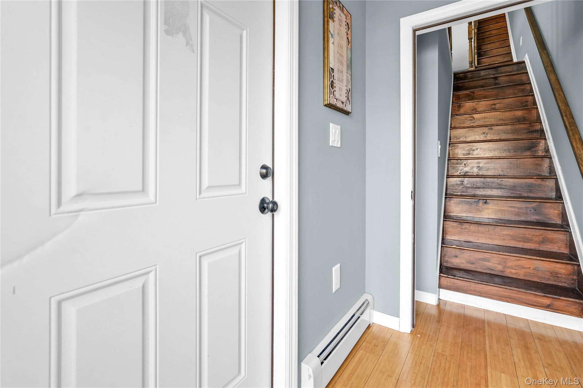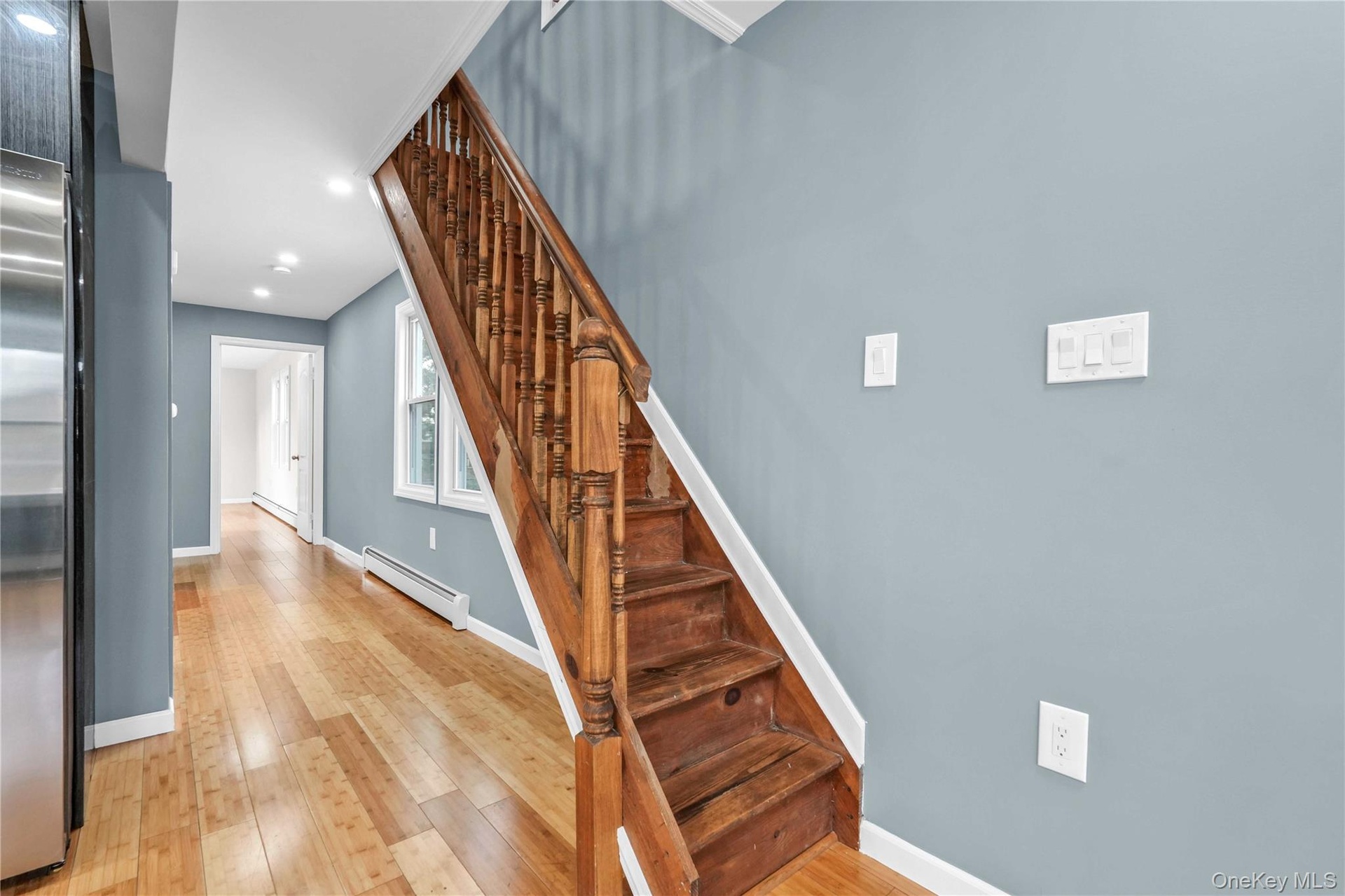 - Staircase with hardwood / wood-style flooring, a baseboard radiator, and recessed lighting
