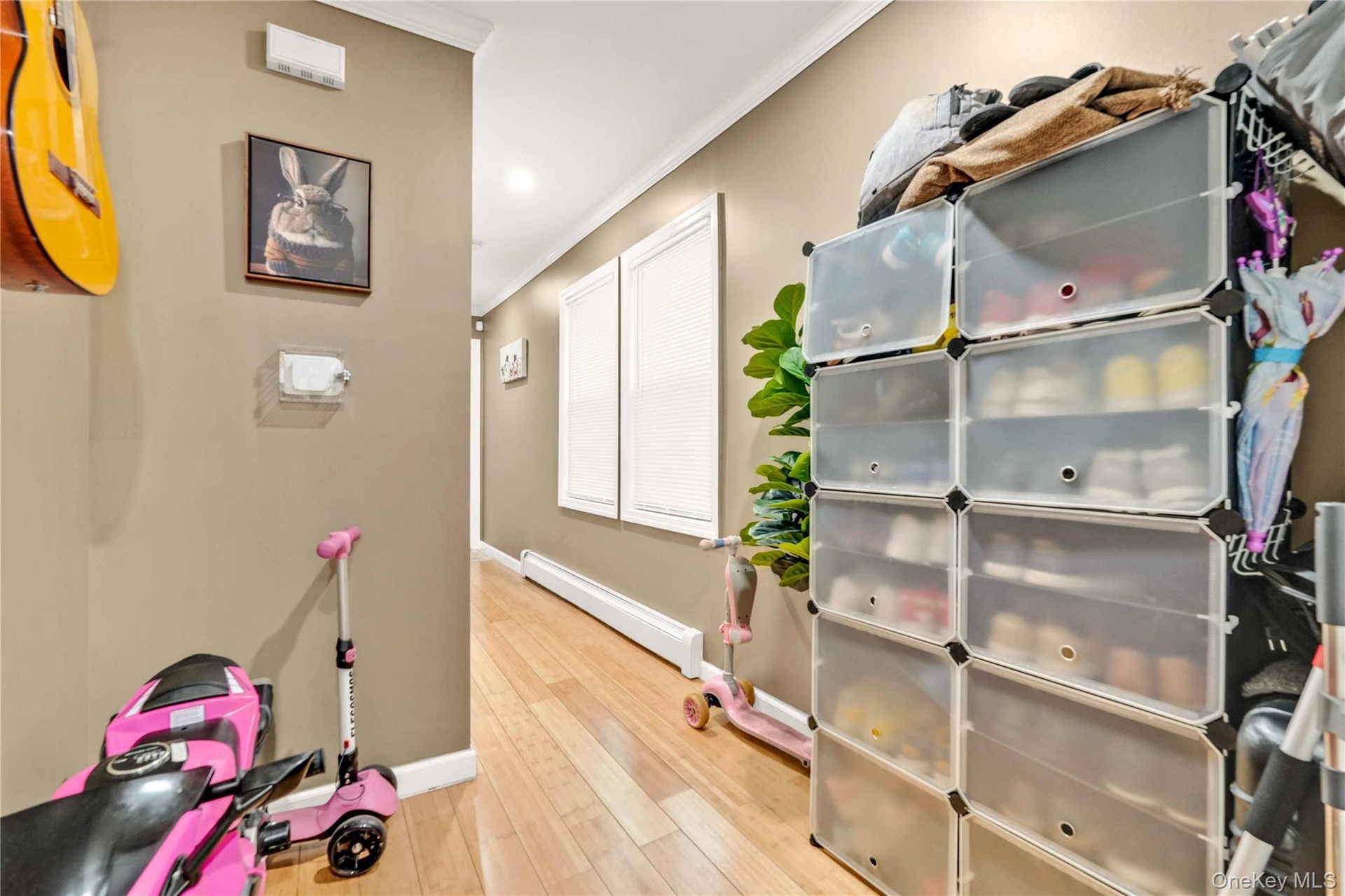 - Workout area with ornamental molding, light wood-type flooring, a baseboard heating unit, and recessed lighting