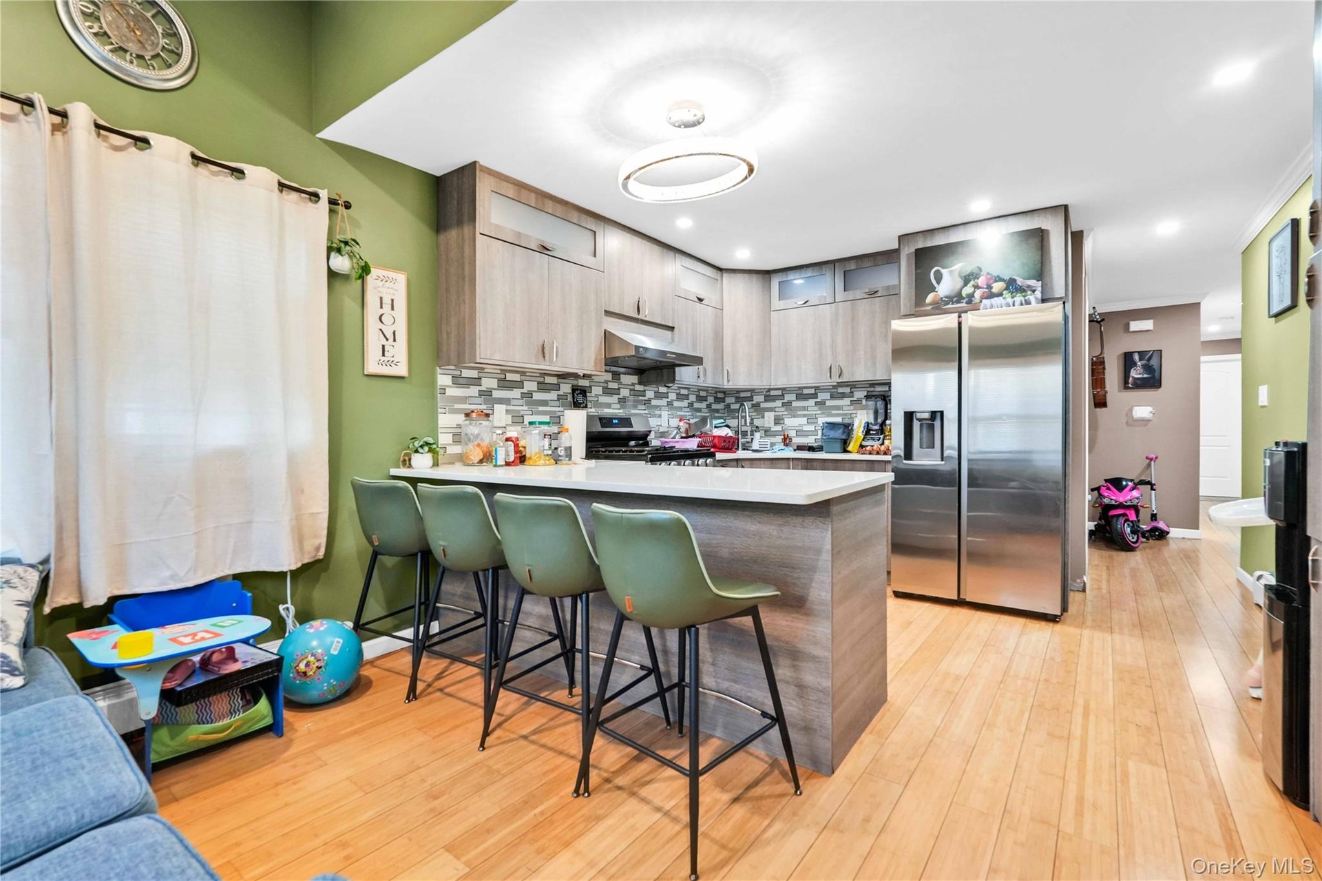 - Kitchen featuring a breakfast bar, appliances with stainless steel finishes, decorative backsplash, a peninsula, and light wood-type flooring