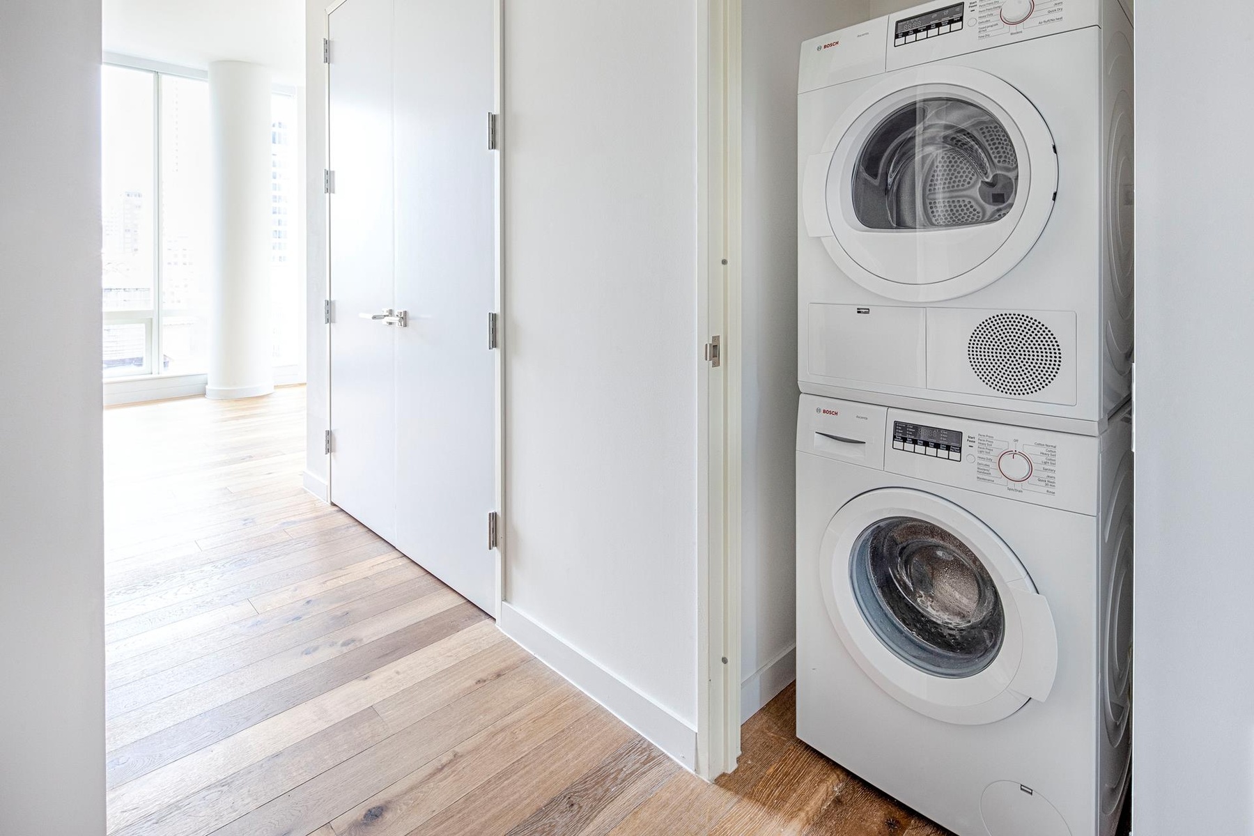 The chefs kitchen is equipped with custom walnut cabinets, quartz counter tops and a Liebherr, Bosch & Bertazzoni appliance package that opens into the spacious living space with floor to ceiling windows and open views of the Manhattan skyline. The bathroom is equipped with Calacatta marble, a rain shower head and soaking tub. To finish if off, in unit WASHER/DRYER!