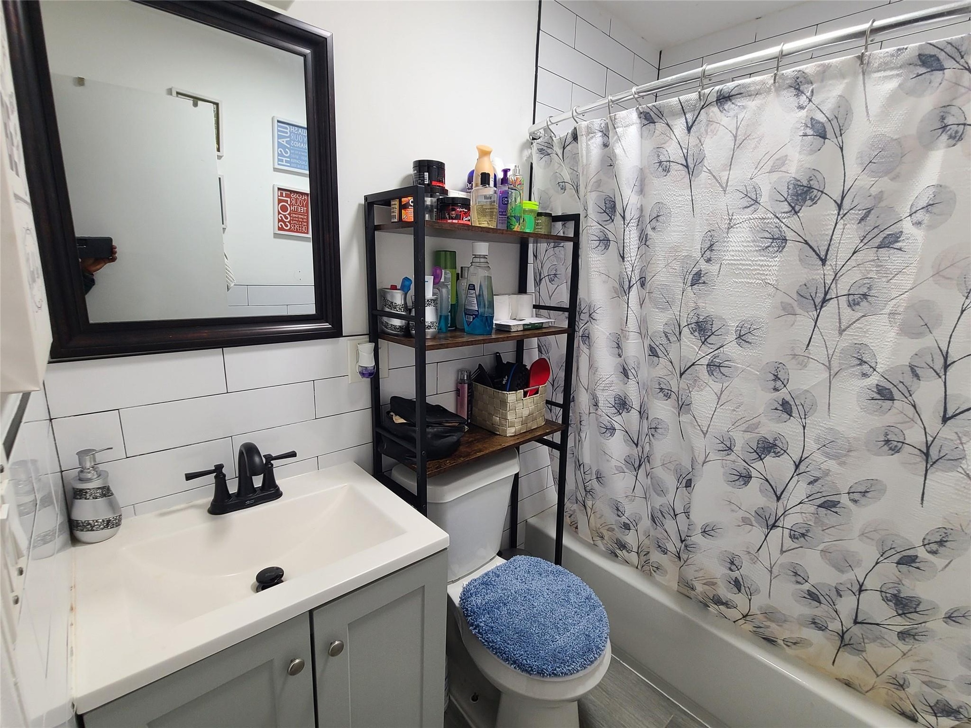 - Full bath with shower / tub combo with curtain, toilet, tasteful backsplash, tile walls, and vanity