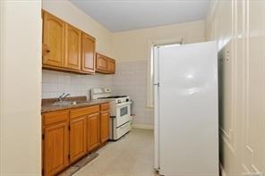 - Kitchen with backsplash, brown cabinets, freestanding refrigerator, and a sink