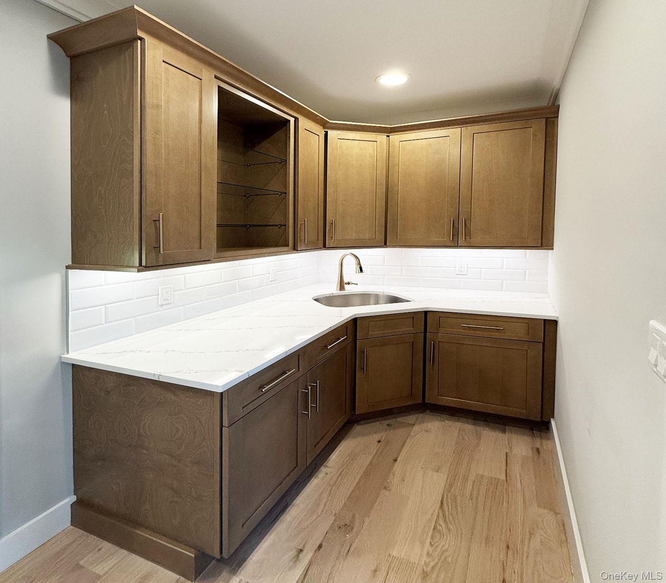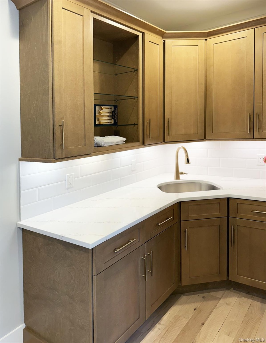 - Kitchen with a sink, open shelves, light wood-type flooring, and backsplash