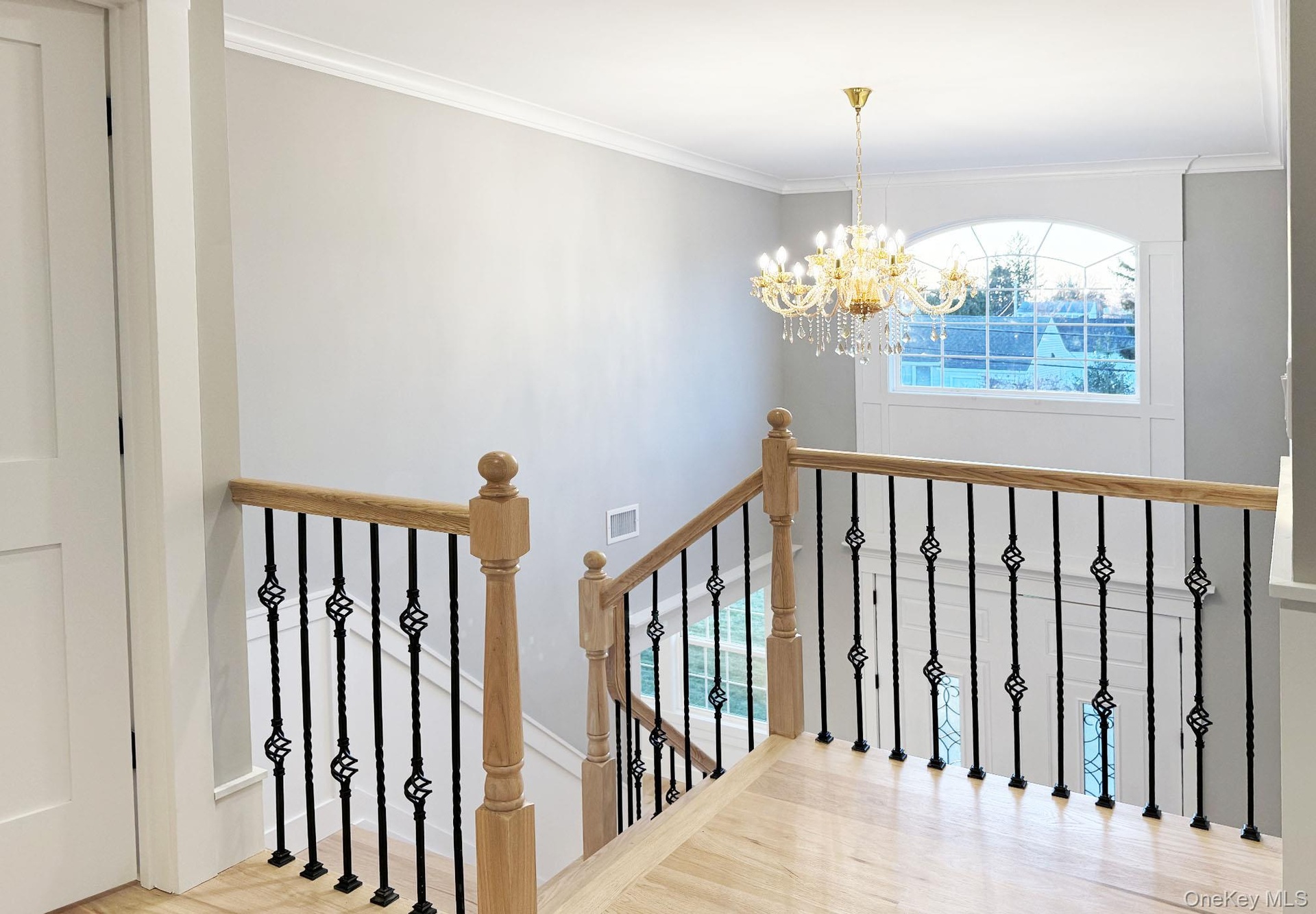 - Stairs featuring a chandelier, visible vents, and crown molding