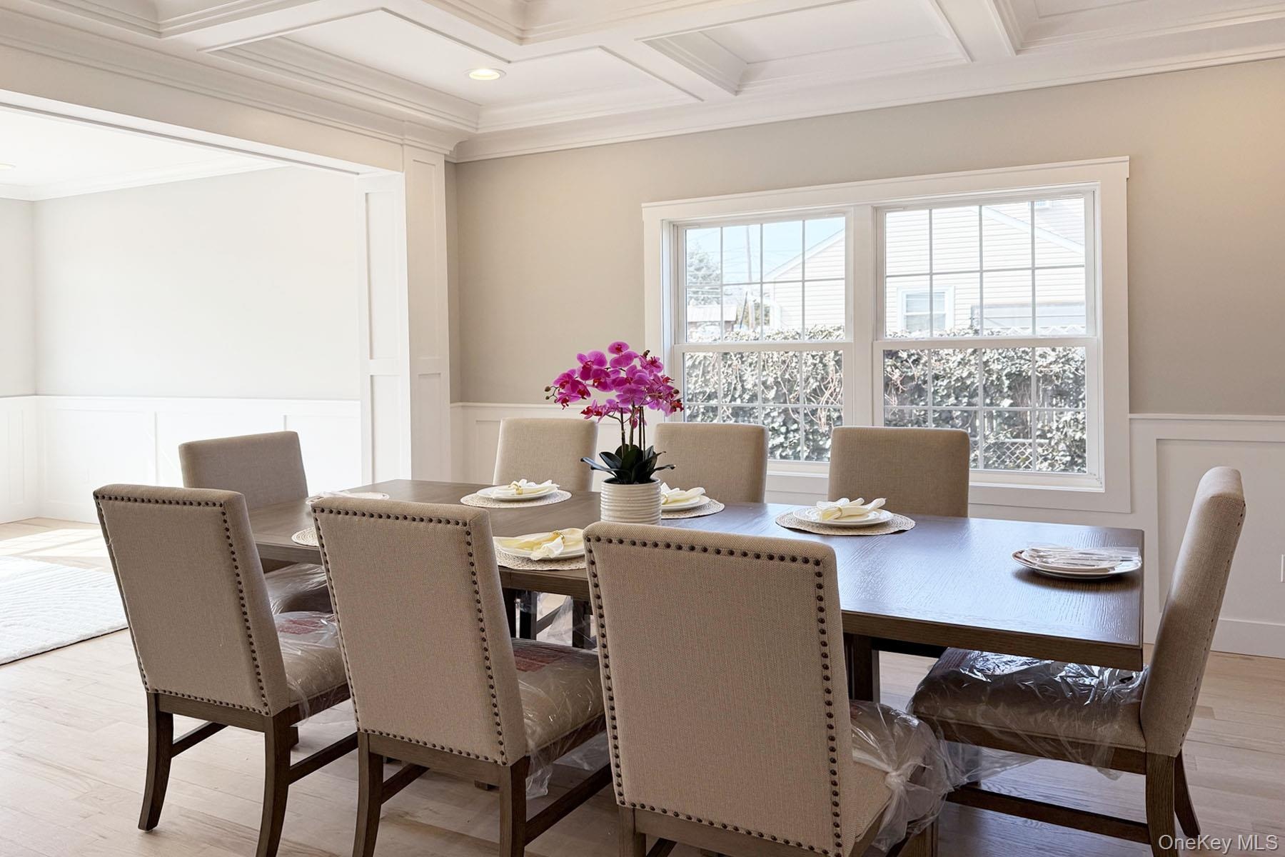 - Dining room featuring wood finished floors, a wainscoted wall, coffered ceiling, beam ceiling, and ornamental molding