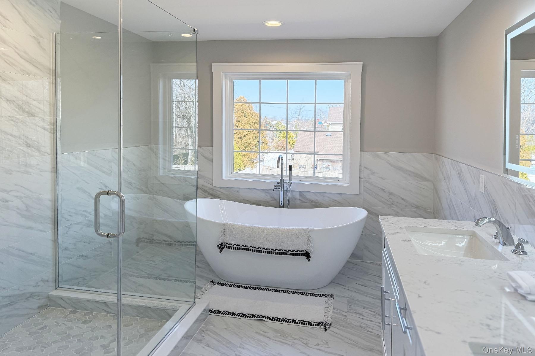 - Full bathroom featuring vanity, recessed lighting, a stall shower, a freestanding bath, and marble finish floor