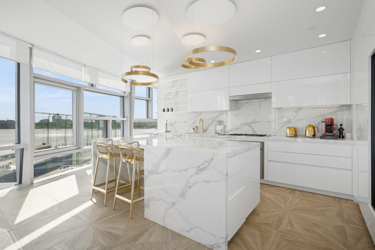 Floor-to-ceiling windows, soaring ten feet high, frame sweeping views of the Hudson River and downtown Manhattan to the south and west, offering a captivating backdrop to everyday life. The state-of-the-art kitchen, crafted by Cesar Cucine, features bespoke lighting, a porcelain island, and premium appliances from Bosch, Thermador, and Viking, ensuring a culinary experience beyond compare. Newly renovated bathrooms exude opulence with porcelain surfaces, Kohler tubs, and pristine sanitary ware.