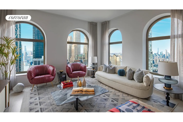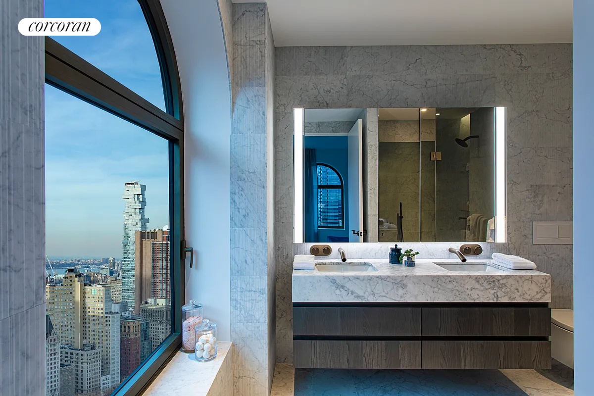 Residence 43C is a corner three bedroom, three bathroom home with approximately 10 foot ceilings and oversized arched windows with elegant bronze detailing framing expansive New York City skyline views. Interior finishes include wide-plank white oak flooring and oil rubbed bronze fixtures custom designed by Sir David Adjaye. The residence boasts an open kitchen with custom Pedini Italian textured blackened oak cabinetry, Salvatori Pietra Cardosa marble countertops and backsplash hand-selected from the Apuan Alps in Tuscany with a Salvatori Nero Marquina cantilever providing additional seating, and state-of-the-art appliances by Gaggenau, Bosch, and Thermador, including wine storage. The corner primary bedroom suite has a generous windowed walk-in closet and a luxuriously appointed windowed bathroom with textured Italian Bianco Carrara marble, a custom Pedini Italian millwork double vanity, an expansive shower and 6-foot soaking tub, and radiant heated floors. There are two generous secondary bathrooms in the residence with custom Pedini Italian millwork vanities, one complete with Salvatori Grigio Versilia marble throughout and a soaking tub, the other with Salvatori Bianco Carrara marble throughout and an expansive shower.