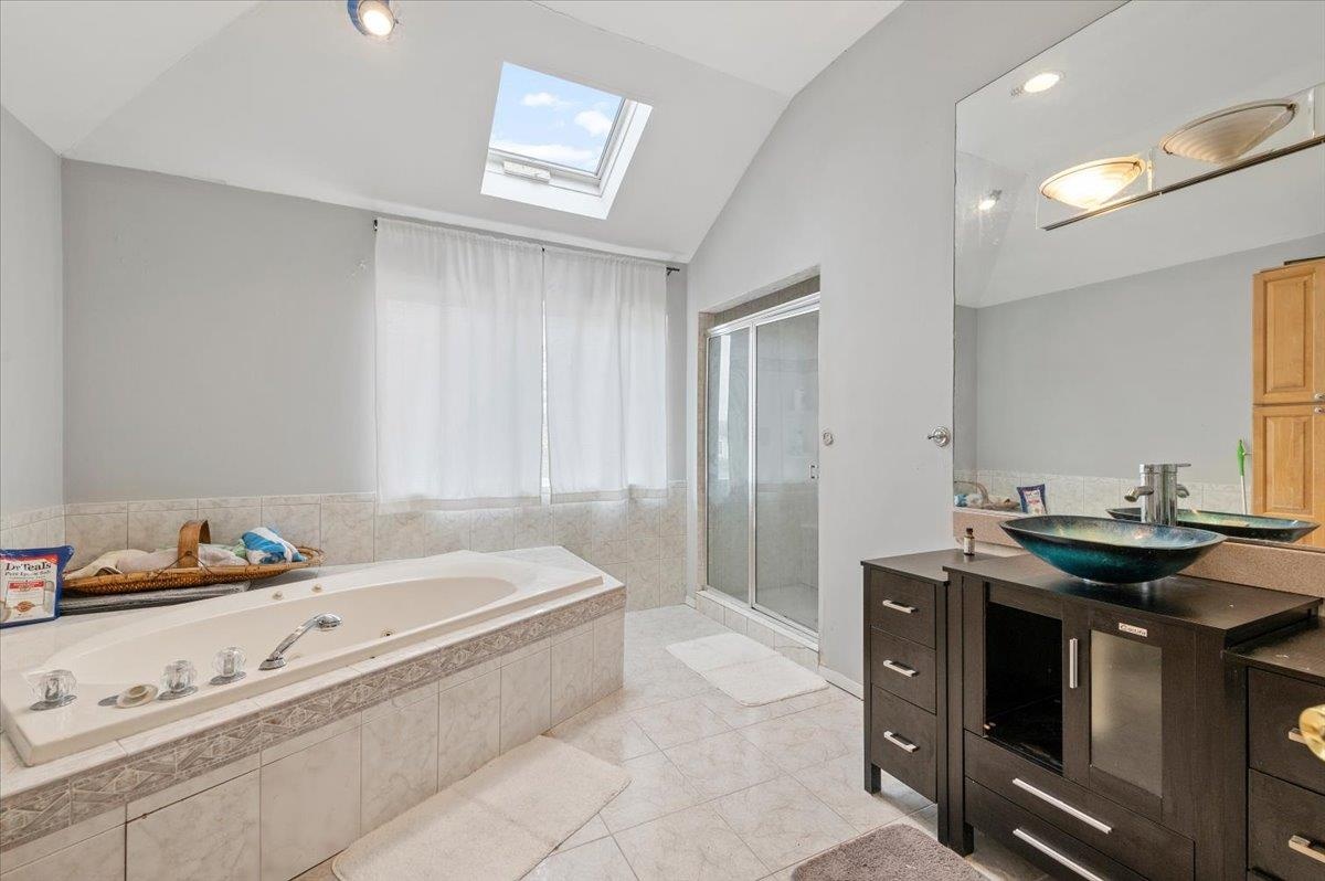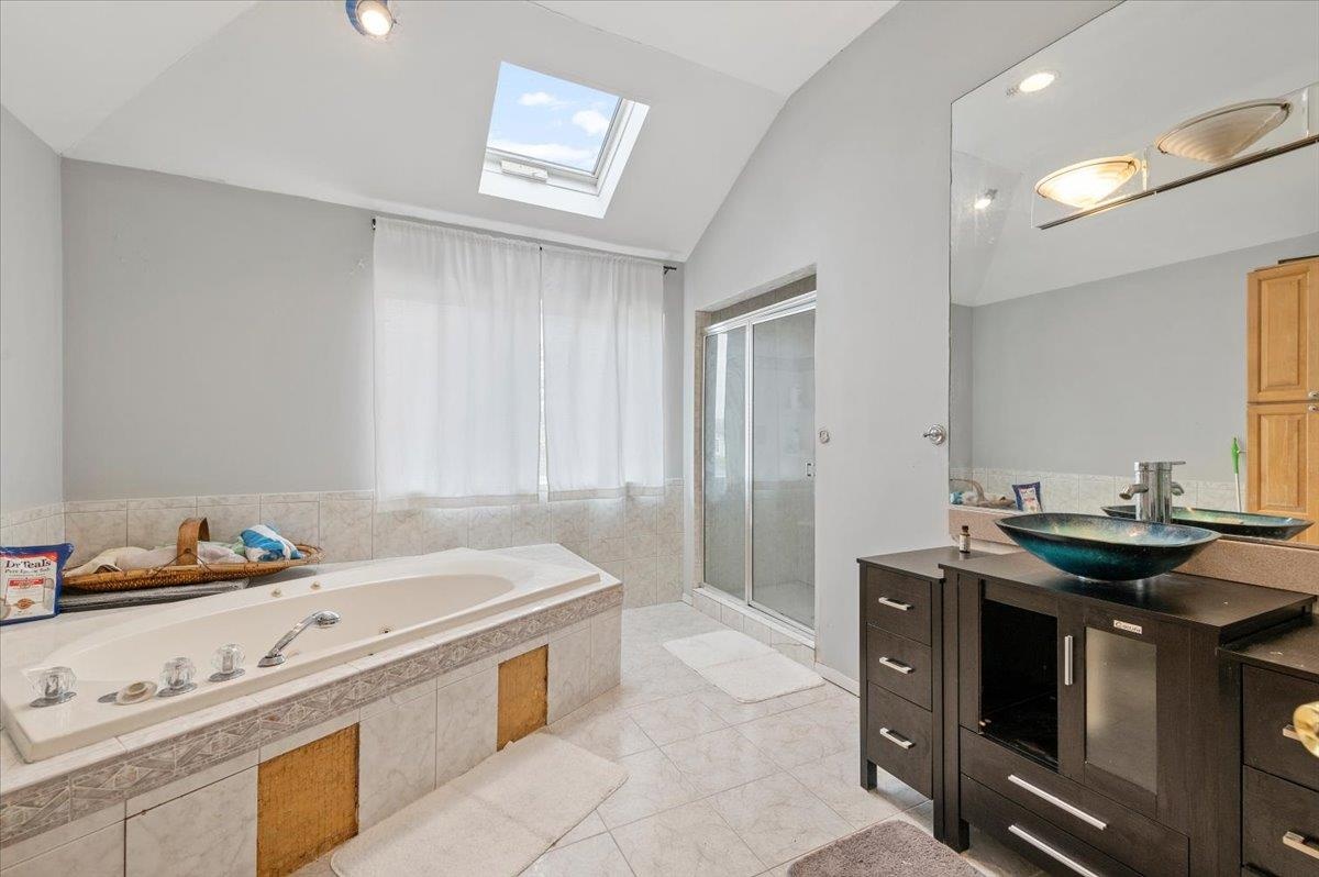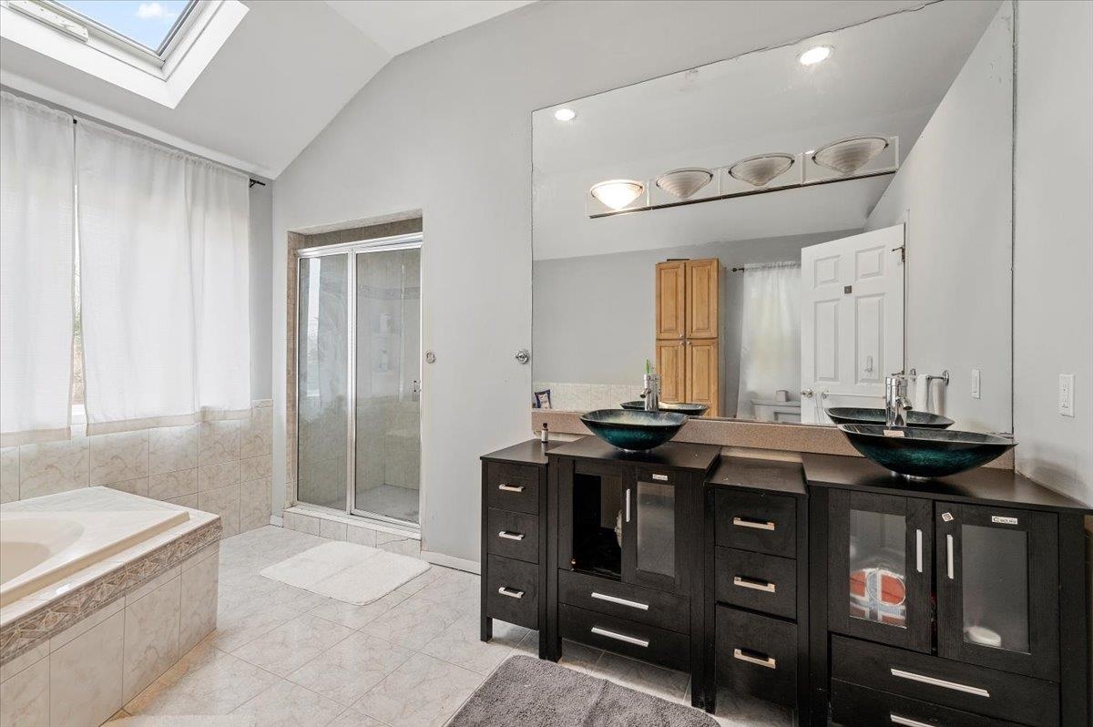 - Bathroom with tile patterned floors, a stall shower, vaulted ceiling with skylight, a tub with jets, and vanity