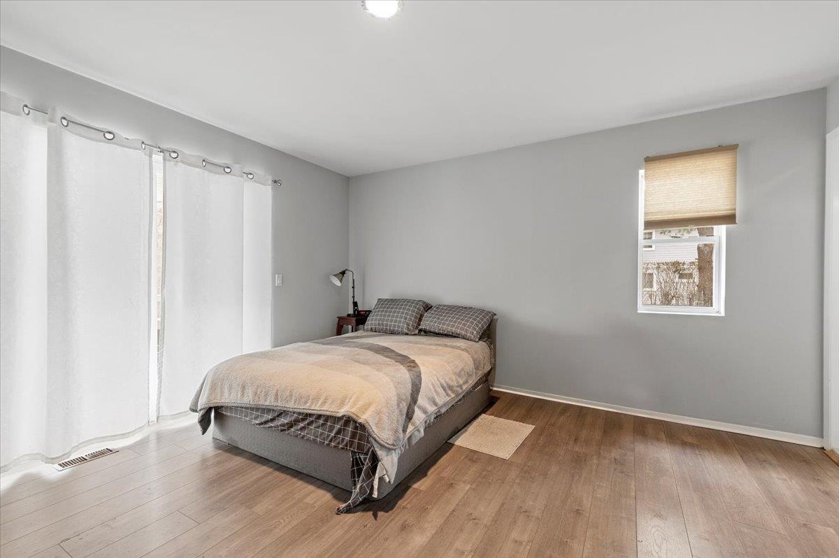 - Bedroom featuring hardwood / wood-style flooring, baseboards, and visible vents