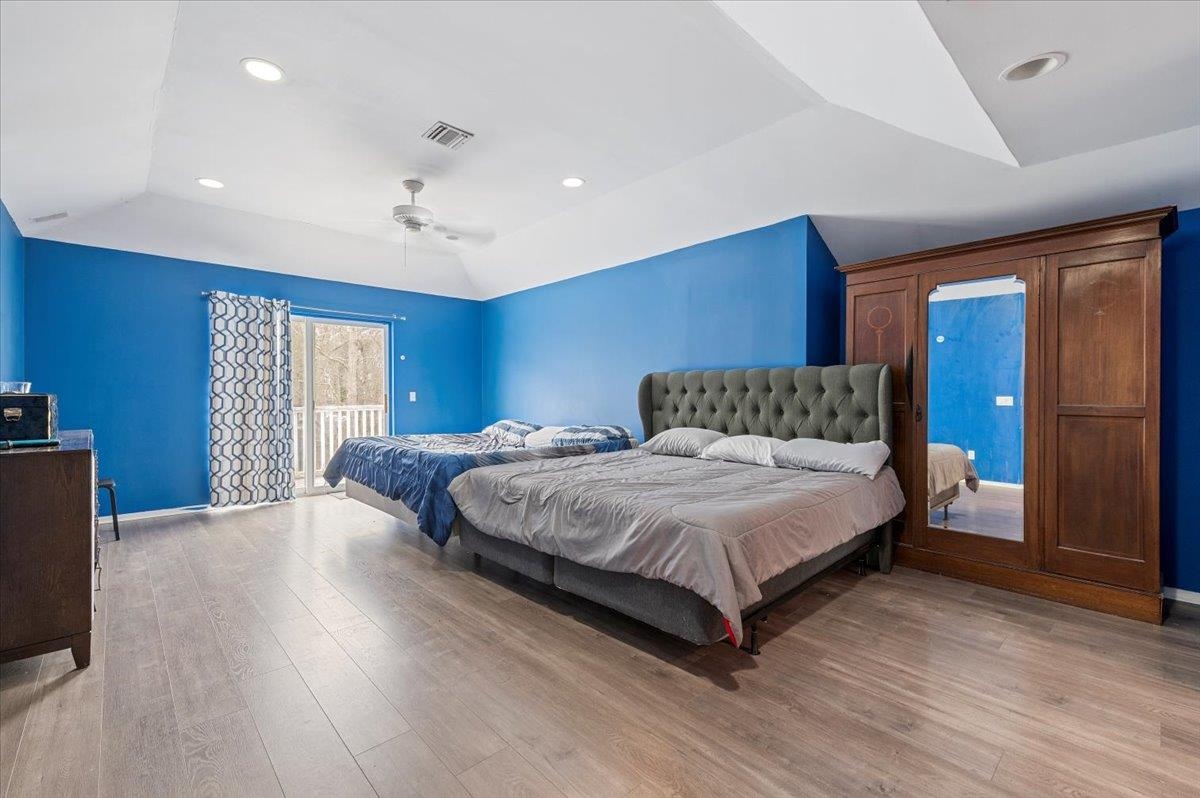 - Bedroom with a ceiling fan, visible vents, lofted ceiling, access to outside, and light wood-type flooring