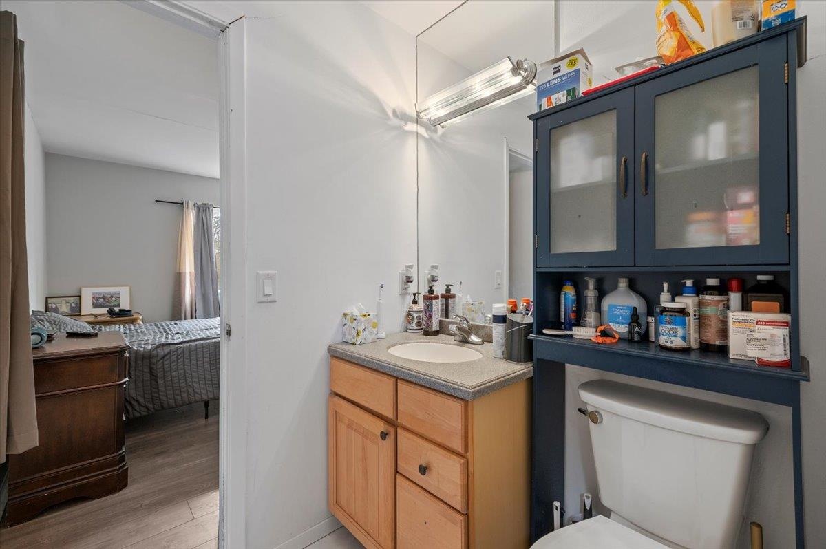 - Ensuite bathroom with ensuite bath, toilet, vanity, and wood finished floors