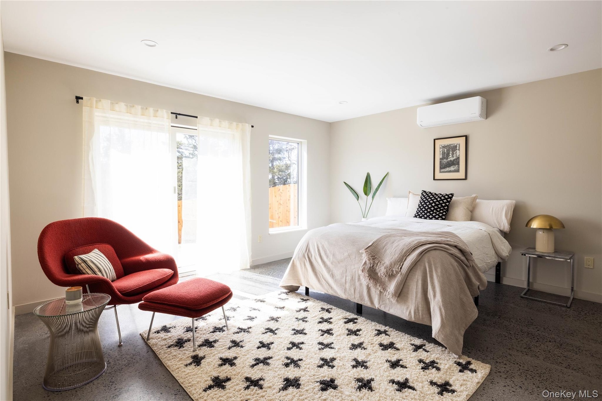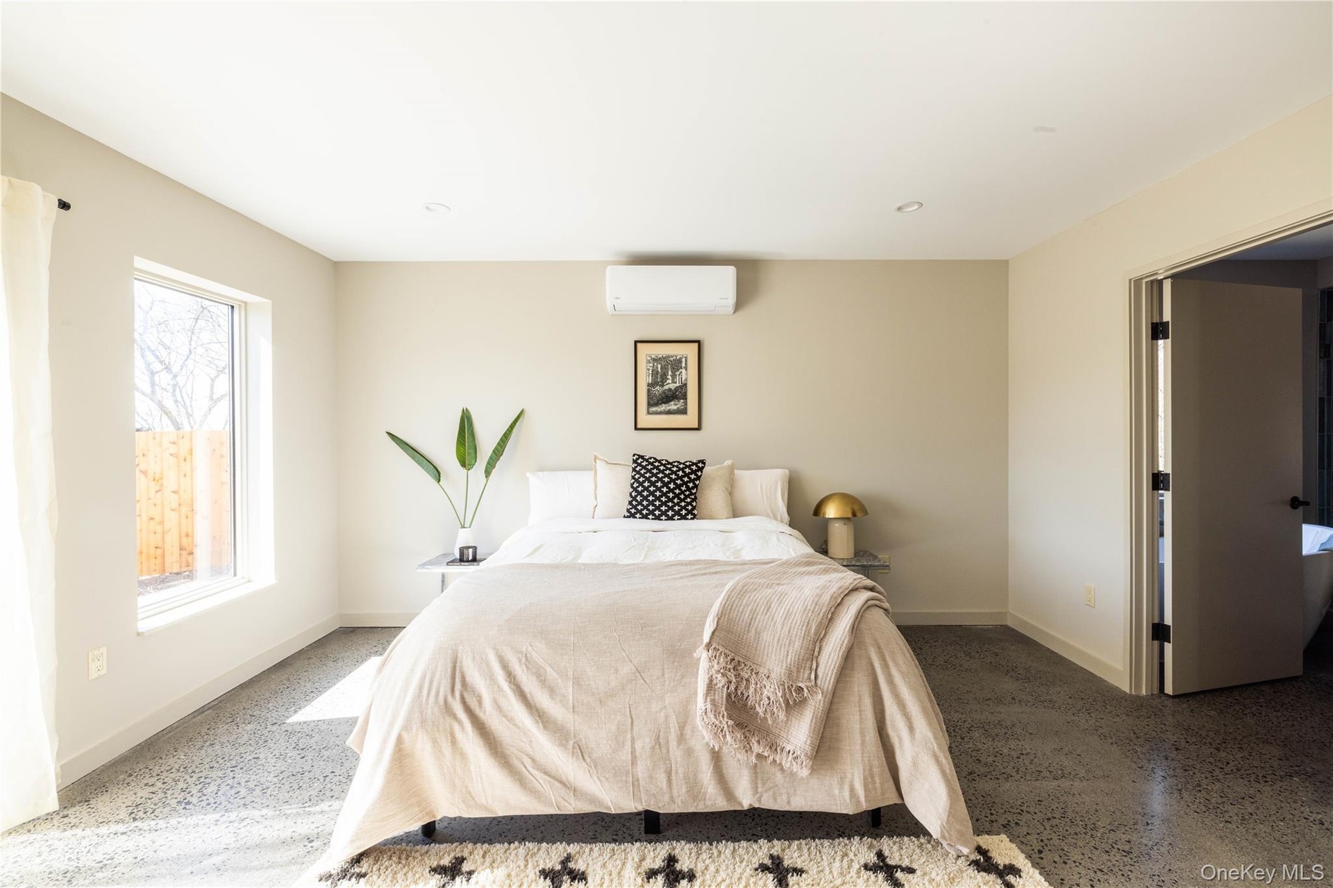 - Bedroom with speckled floor, recessed lighting, baseboards, and a wall mounted AC