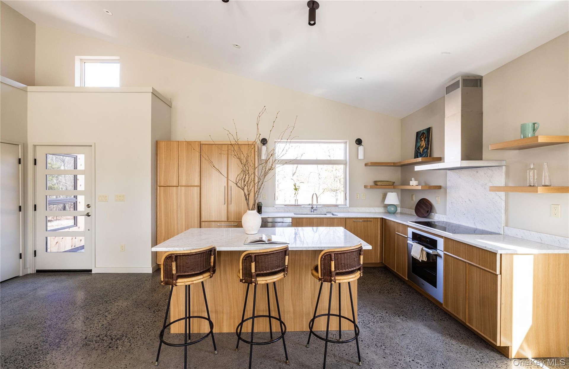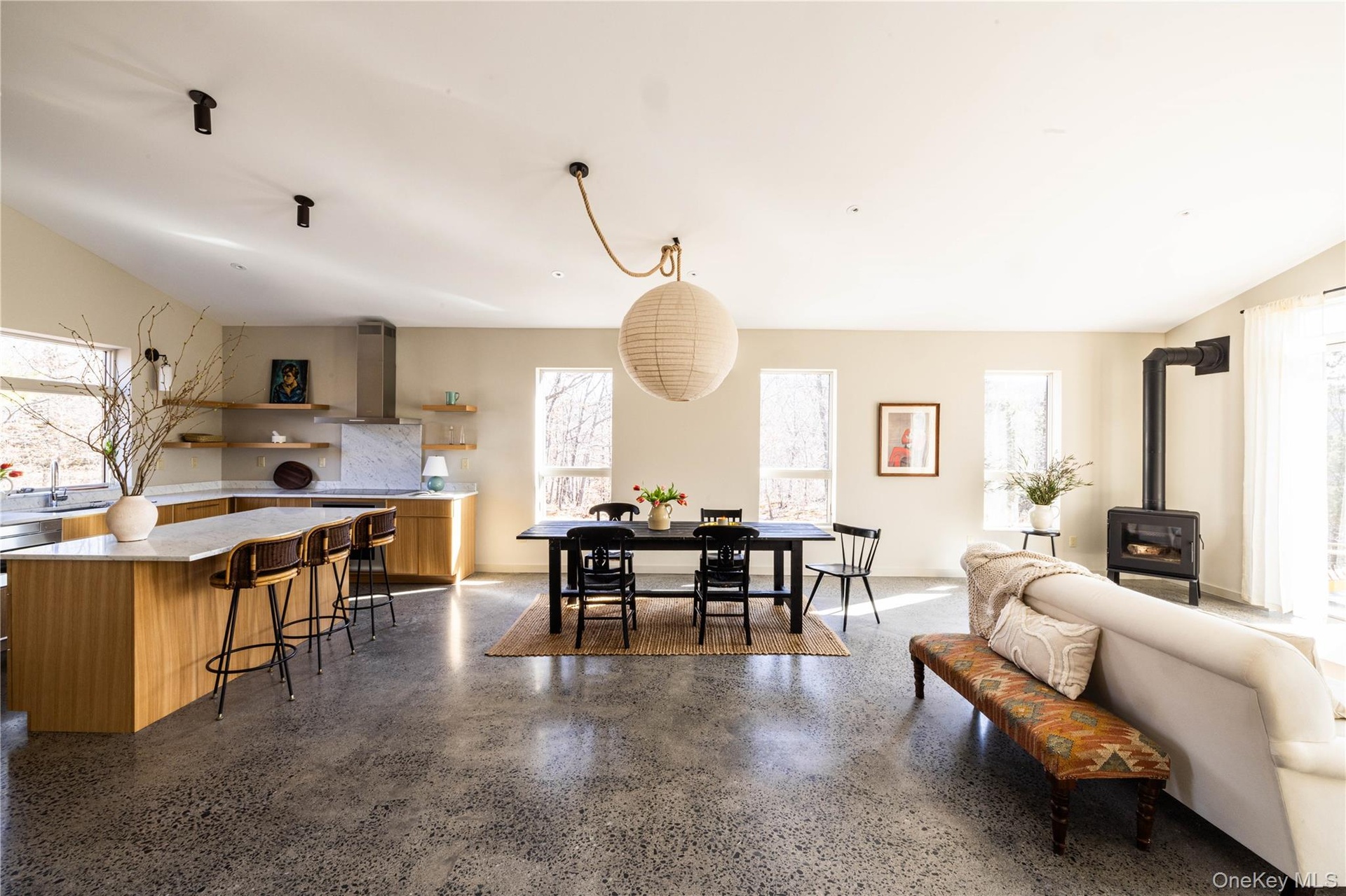 Step into the striking double-height great room, the heart of the home, featuring clean lines and natural materials, radiant-heated polished concrete floors, a sculptural woodstove, and two oversized slider doors that open onto a bluestone patio. The expansive windows, oriented to capture the morning sun, flood the space with natural light, enhancing the architectural elegance and connection to nature. An open-concept chef’s kitchen is both functional and artful, showcasing handcrafted cabinetry, honed marble countertops, and Miele appliances, perfect for both intimate dinners and larger gatherings.
