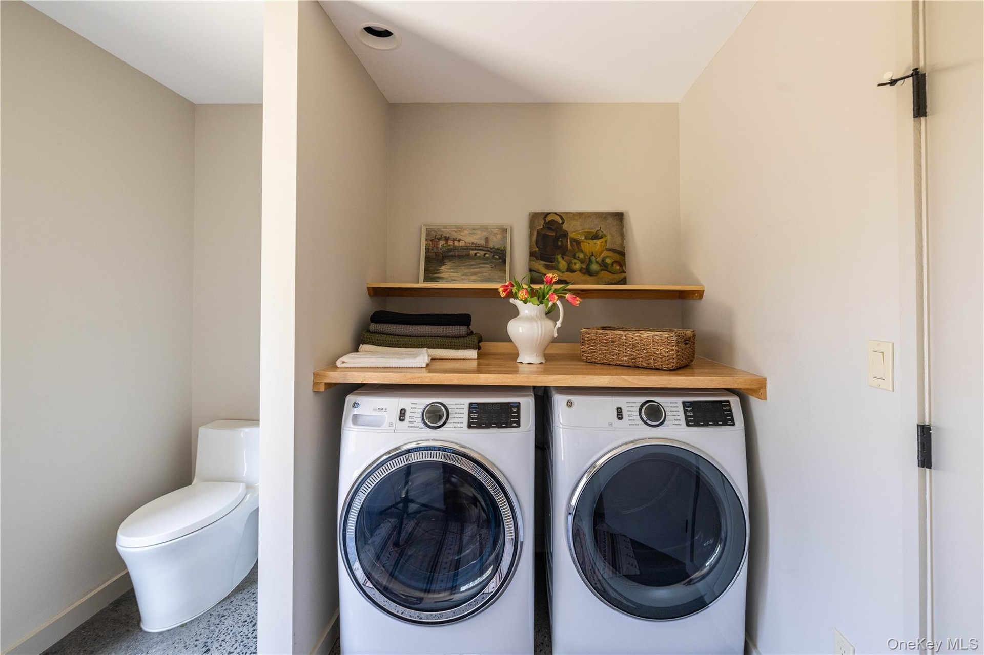 - Washroom with laundry area, washing machine and dryer, and baseboards