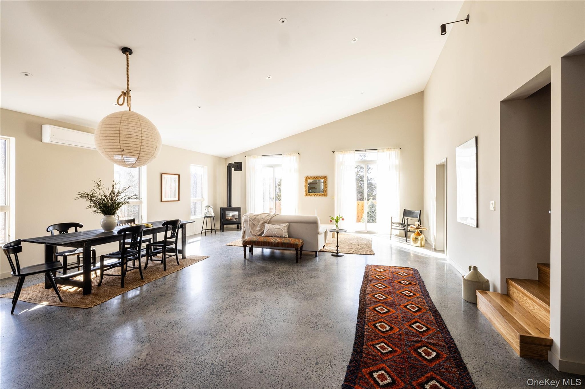 - Dining area with high vaulted ceiling, stairway, and an AC wall unit