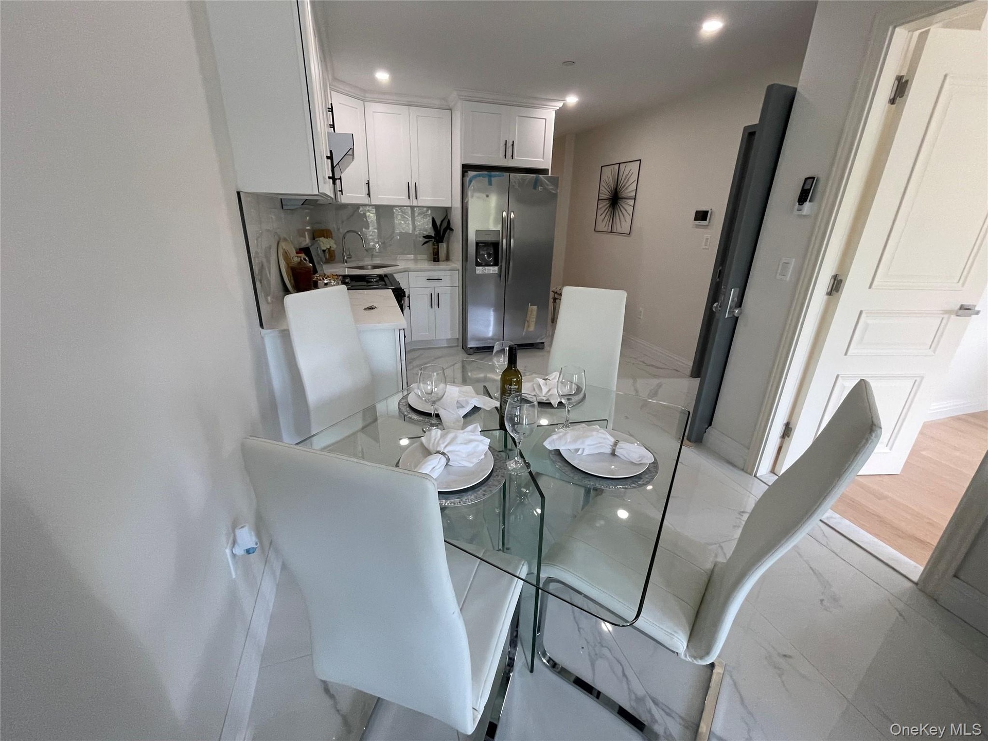 - Dining room featuring light marble finish flooring and recessed lighting