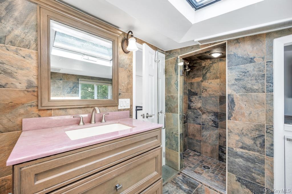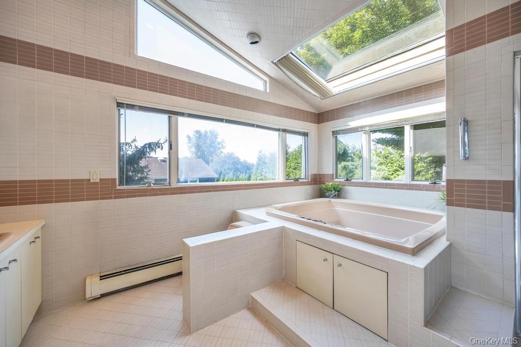 The expansive primary suite features a vaulted ceiling with a skylight, complemented by a large en-suite bath complete with a jet tub and separate standing shower. The bathroom is further enhanced by heating lamps overhead and a skylight, adding brightness and a sense of serenity.
