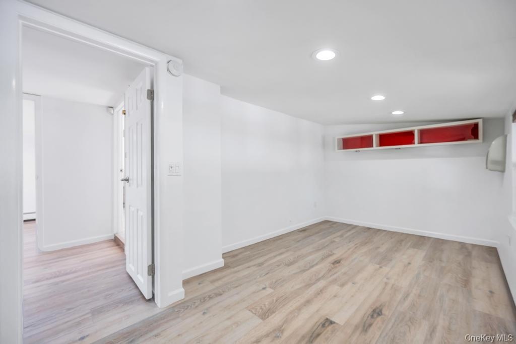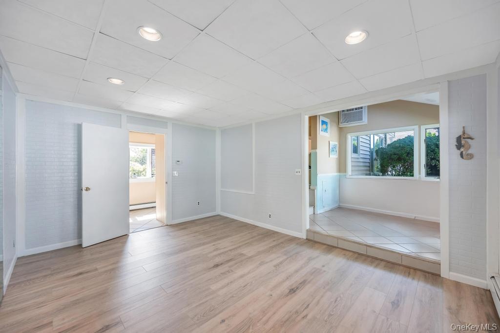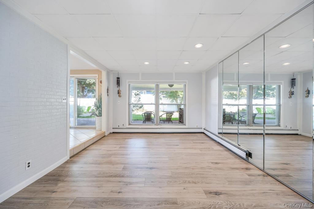 - Unfurnished room featuring light wood-style floors, a drop ceiling, a baseboard heating unit, and recessed lighting