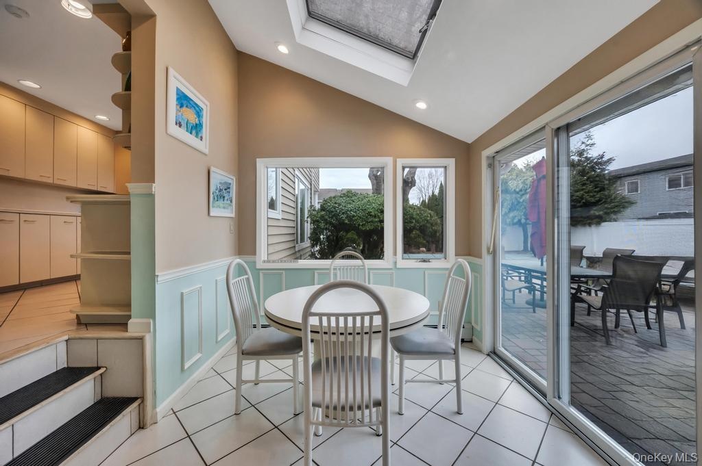The open-concept kitchen and dining area provide a seamless flow, perfect for both everyday living and hosting gatherings. Begin your mornings in the bright breakfast nook, where vaulted ceilings and a skylight create a cozy spot to bask in the warmth of natural light.