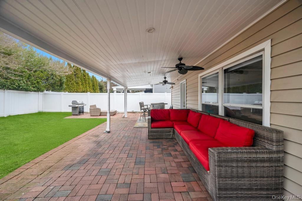 - View of patio featuring area for grilling, an outdoor living space, a fenced backyard, outdoor dining area, and ceiling fan