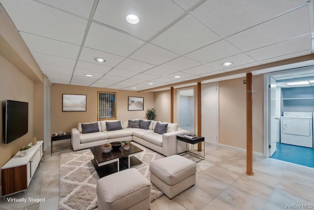 - Living area with recessed lighting, washer and dryer, and a drop ceiling