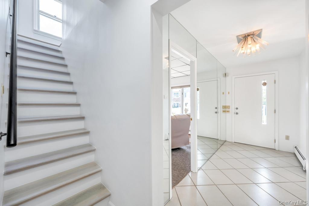 - Foyer featuring plenty of natural light, light tile patterned floors, a chandelier, and baseboard heating