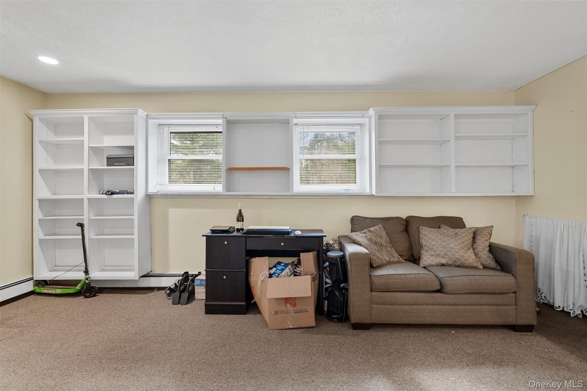- Living area featuring recessed lighting, a baseboard heating unit, light wood-style floors, and a wood stove