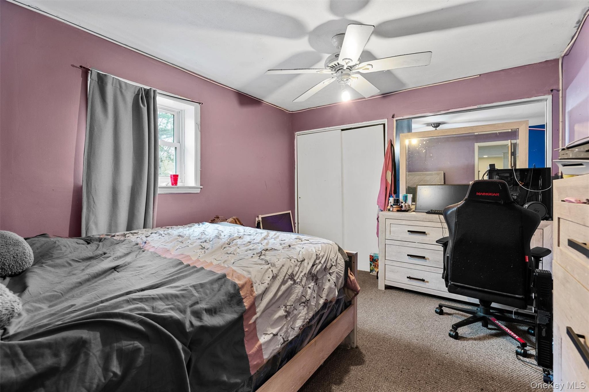 - Bedroom with baseboards, a textured ceiling, carpet, and a ceiling fan