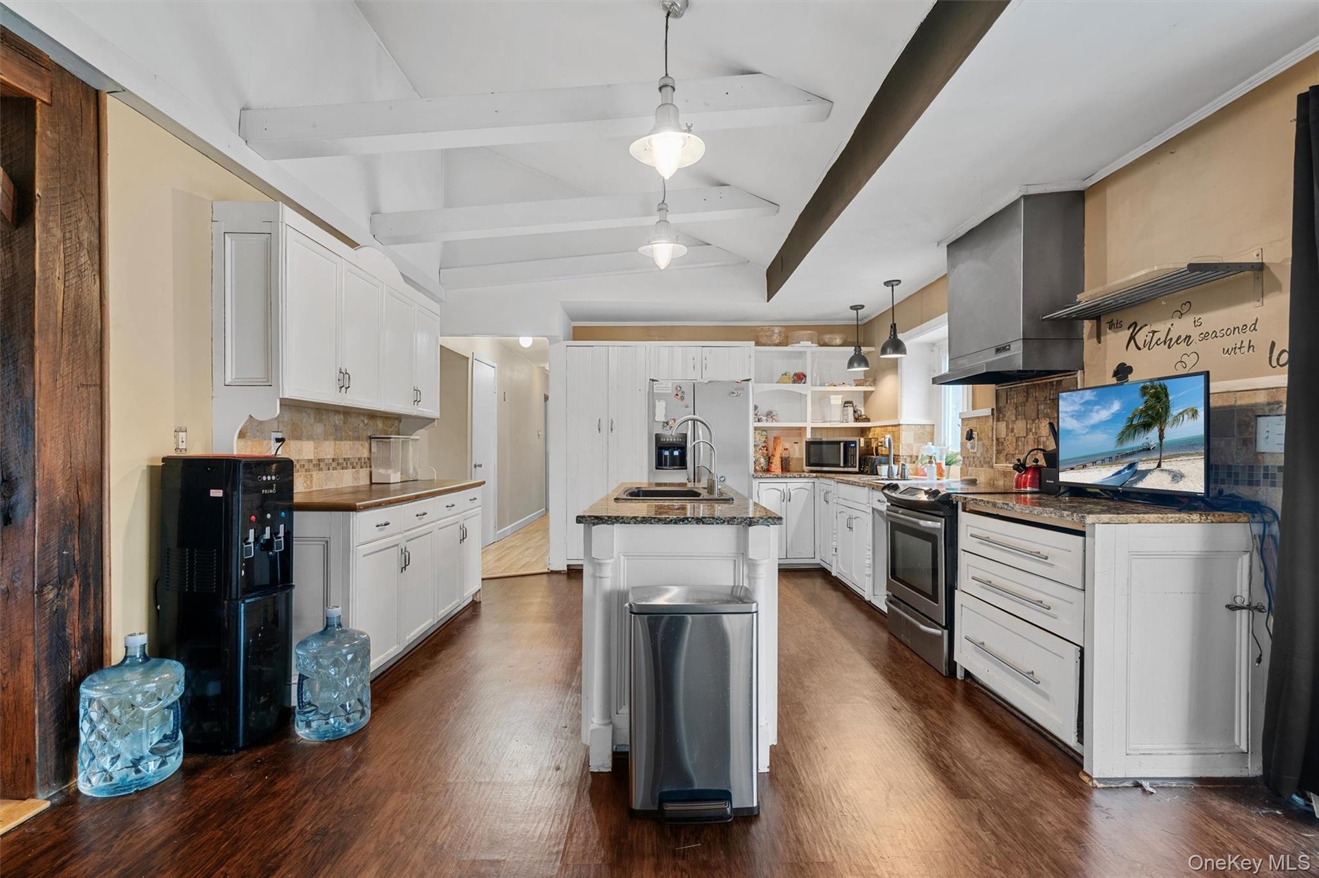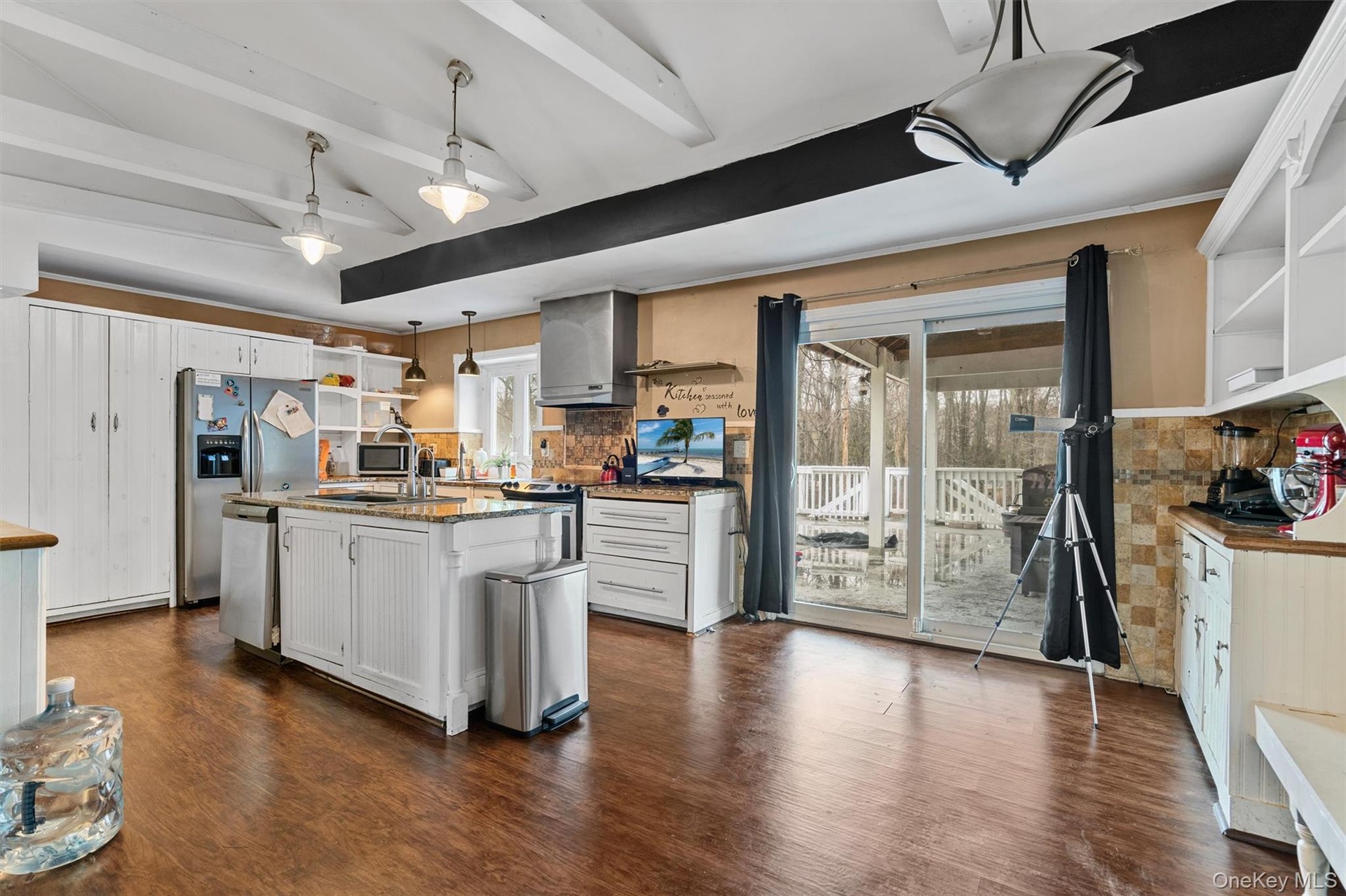 - Kitchen featuring a center island with sink, open shelves, lofted ceiling with beams, stainless steel appliances, and wall chimney range hood
