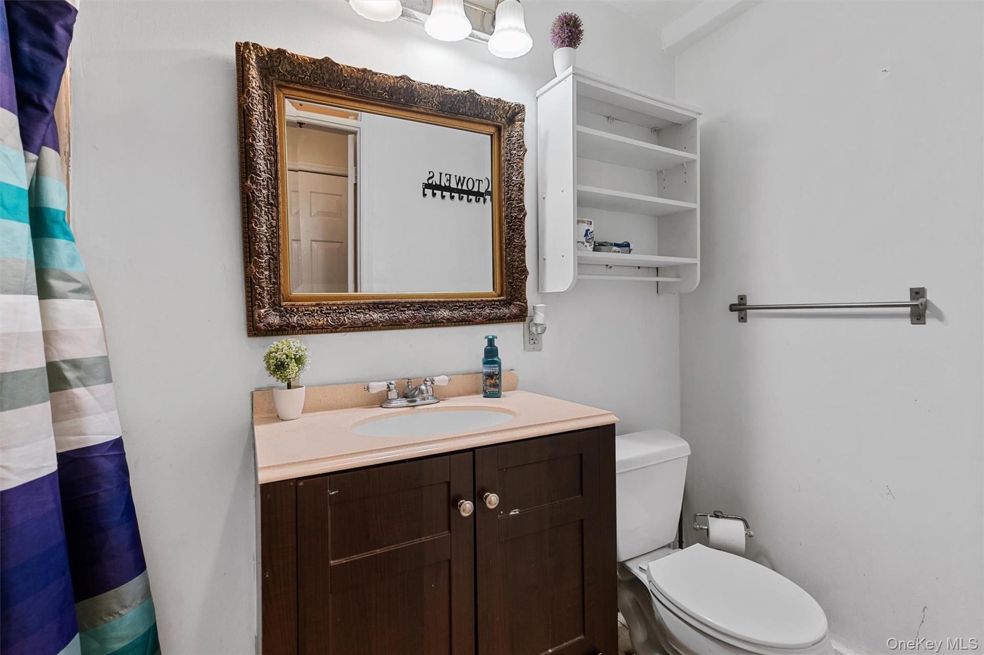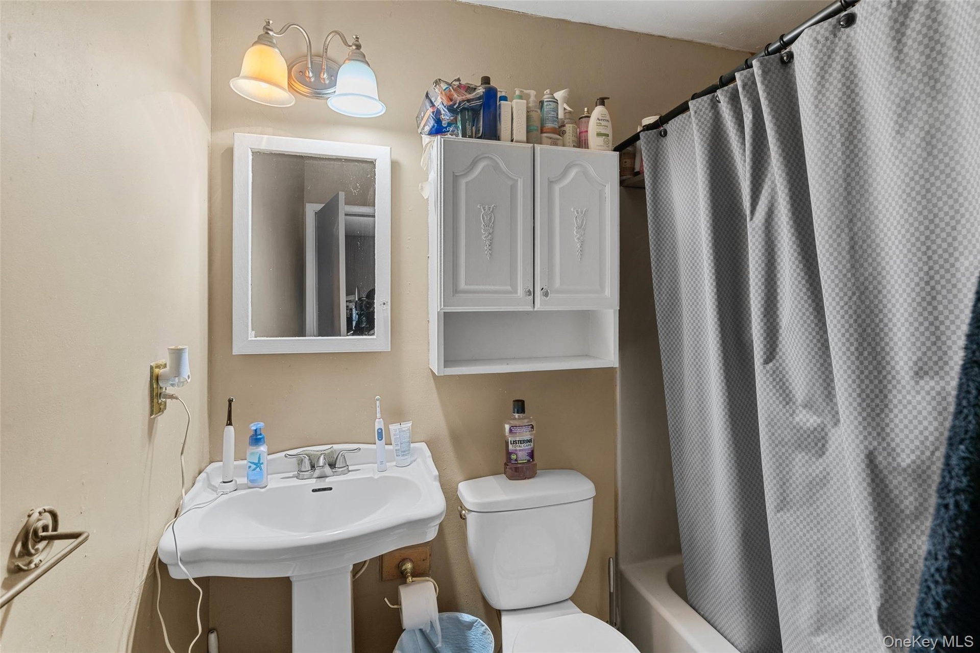 - Full bath with toilet, shower / tub combo with curtain, and a sink