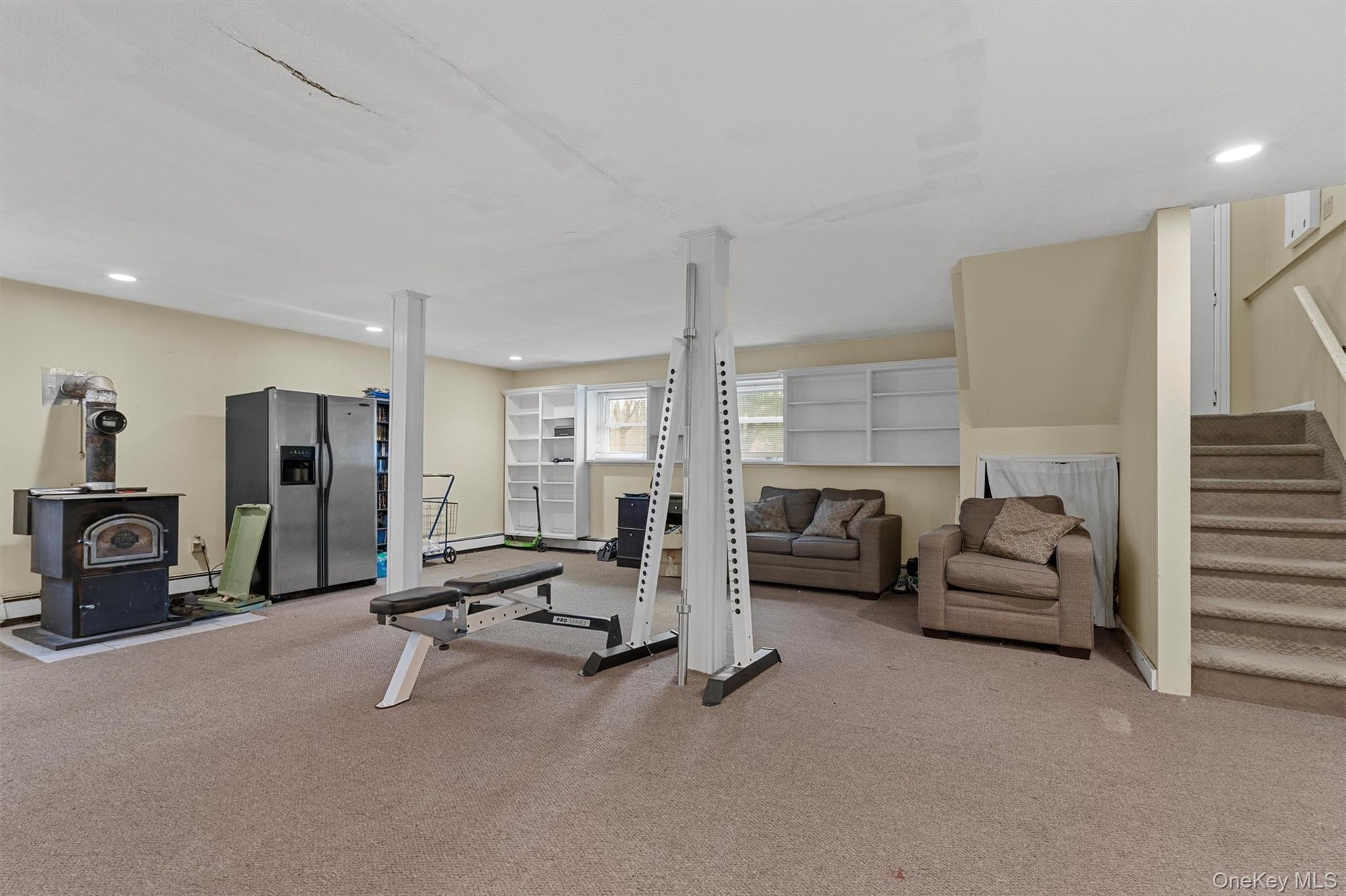 - Exercise area featuring recessed lighting, a wood stove, and carpet floors