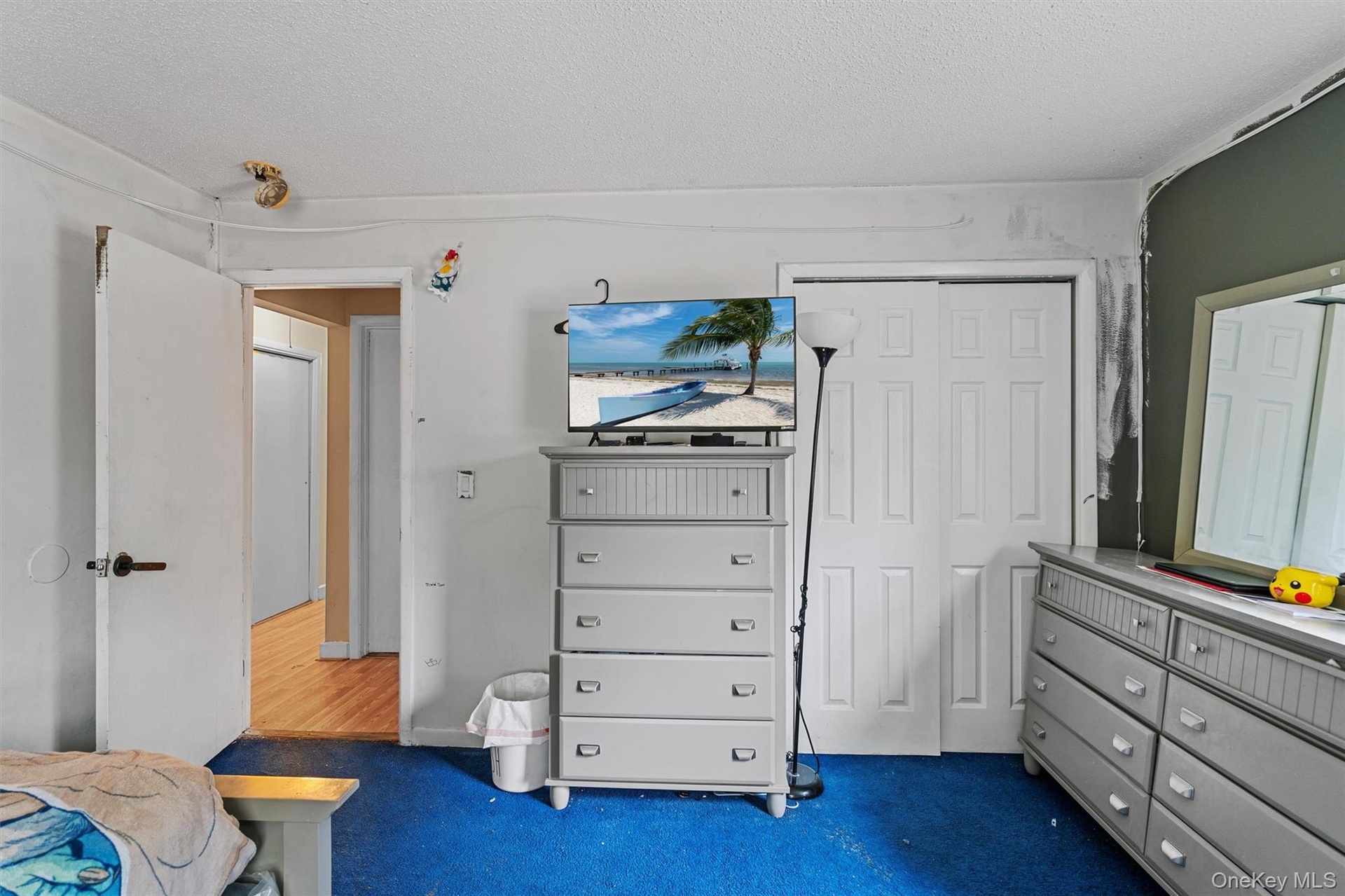 - Bedroom with a ceiling fan, light wood-type flooring, a closet, and a textured ceiling