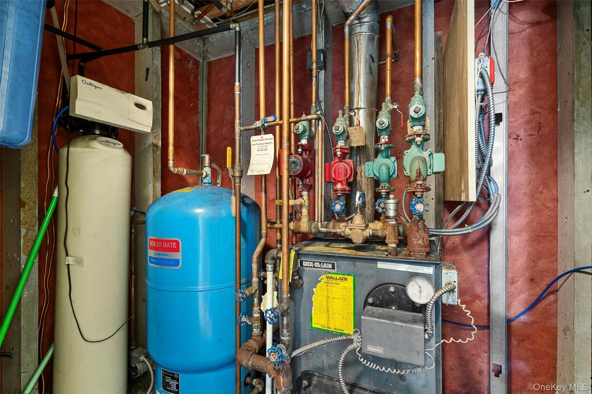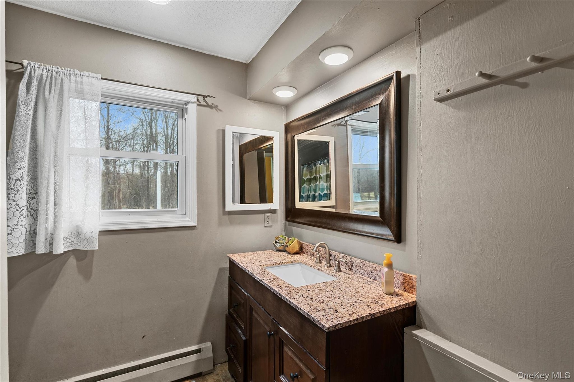 - Interior details featuring a baseboard radiator, baseboards, a baseboard heating unit, and a wood stove