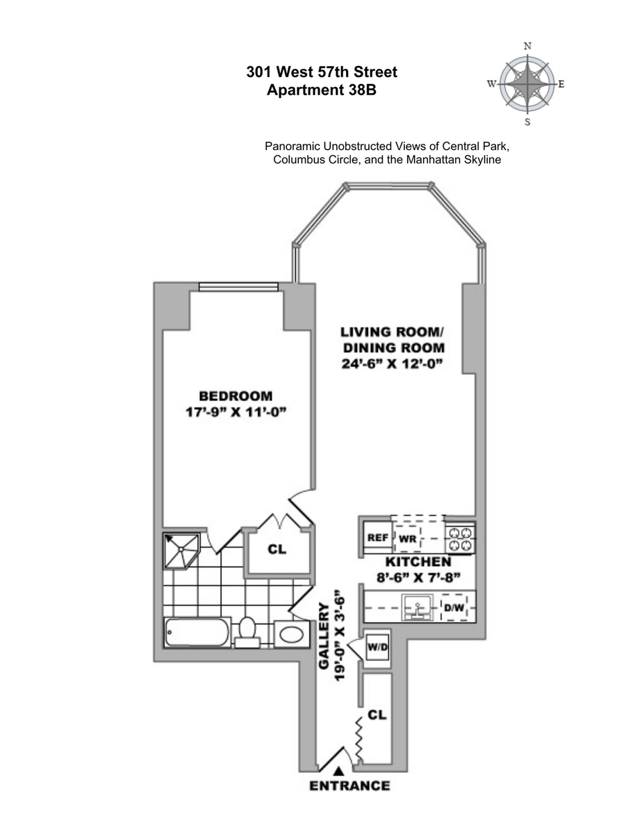 Located high above Columbus Circle, enjoy priceless, unobstructed views of Central Park and the Manhattan skyline from the floor-to-ceiling Bay Windows. This 38th floor one bedroom, one bathroom condominium has undergone extensive designer renovations. The spacious living/dining room features recessed, custom cove lighting and built-in speakers. The pass-through chef's kitchen has top-of-the-line Viking and Subzero appliances, custom glass-facing cabinetry, and wine cooler. The oversized bedroom can easily fit a king-sized bed and additional furniture. The bedroom also features a custom-built closet, en-suite bathroom entrance and breathtaking view of Central Park. The remodeled bathroom has two entrances, a glass spa shower, and free-standing soaking tub. The beautiful entrance gallery has a spacious coat and storage closet, and a full-size washer dryer closet.