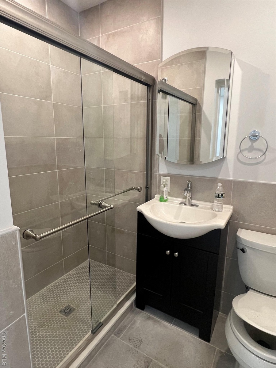 - Full bathroom featuring tile walls, toilet, a shower stall, and vanity