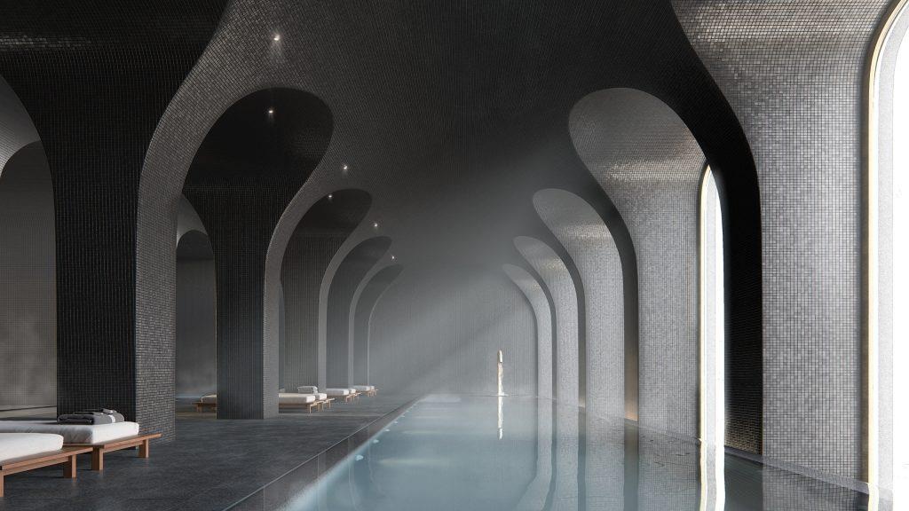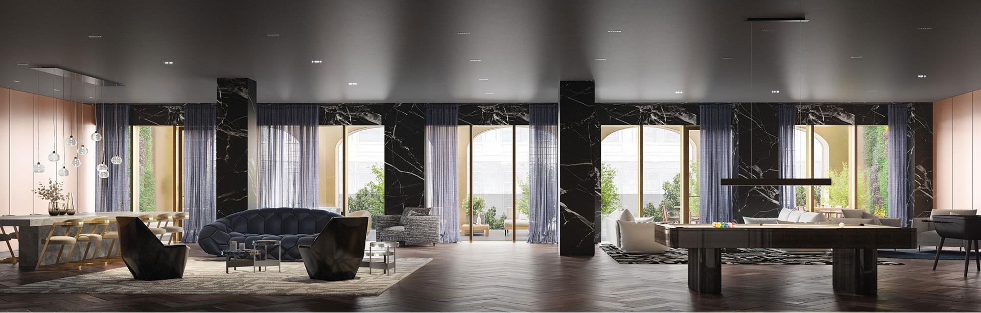 Residence 38D is a corner one bedroom home with approximately 10 foot ceilings and oversized arched windows with elegant bronze detailing framing picturesque river views. Interior finishes include wide-plank white oak flooring and oil rubbed bronze fixtures custom designed by Sir David Adjaye. The open kitchen features custom Pedini Italian textured blackened oak cabinetry, Salvatori Pietra Cardosa marble countertops and backsplash hand-selected from the Apuan Alps in Tuscany, and state-of-the-art appliances by Gaggenau, Bosch, and Thermador. The luxuriously appointed bathroom is designed with textured Italian Bianco Carrara marble, a custom Pedini Italian millwork vanity, a 6-foot soaking tub, and radiant heated floors.
