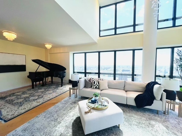 Dream sky-high Duplex Penthouse in the building's coveted 'H' line with stunning river views, three bedrooms and three and a half marble bathrooms. Double height 19 feet high ceilings and windows in the living area with a panoramic South and East view of the East River and Roosevelt Island. Oversize master bedroom with two cedar walk-in closets, huge en-suite master bathroom with his and her sinks, huge Jacuzzi tub and separate shower stall. New wide plank wood floors and renovated eat-in kitchen with stainless steel Wolf appliances, Subzero fridge and Bosch dishwasher, Washer/Dryer. The best corner apartment on top of the building with double exposures, the only Penthouse in the building facing South and East with wrap around floor to ceiling windows. It is a luxurious full-service waterfront Condominium with 24 hour concierge, garage, valet, doormen, porters, handymen, live-in superintendent, children's playroom, roof garden, roof top jogging track, roof top business/conference center with wet bar, storage rooms, maid and dry cleaning services, bicycle room and a very big Residents' Lounge on the top floor (with its stunning river views and its own kitchen & bathroom) that is available for residents' private parties. Common charges include your use of the brand new fully renovated State-of-the-art Fitness Centre, Pilates & Yoga Studio, and a gym offering fitness & meditation classes, locker rooms, sauna, steam rooms, massage room, meditation room, cable TV, top floor heated swimming pool and spa tubs with views galore of the East Side of Manhattan. Steps away from John Jay Park.