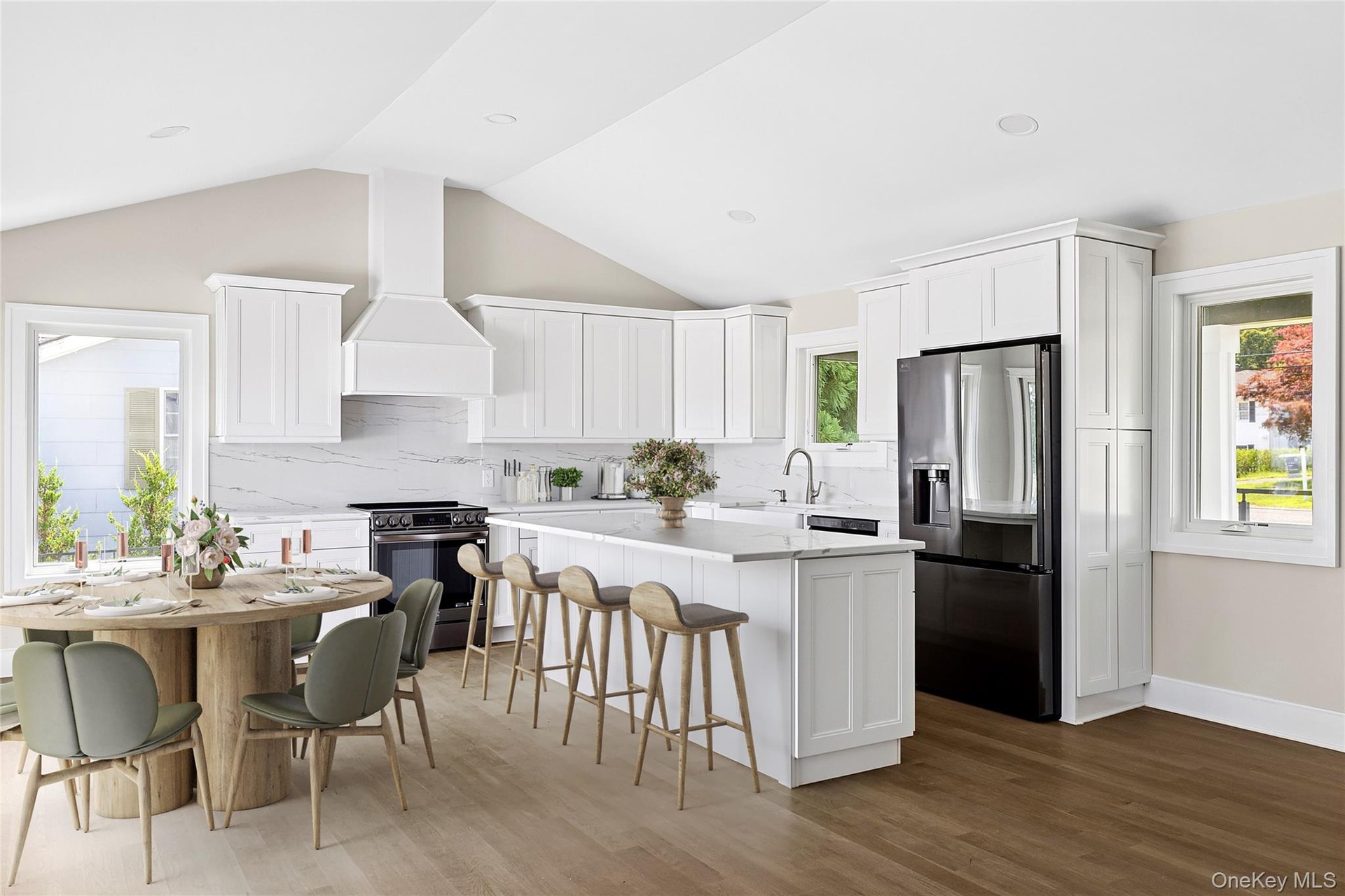 - Kitchen featuring white cabinetry, appliances with stainless steel finishes, tasteful backsplash, a kitchen island, and vaulted ceiling