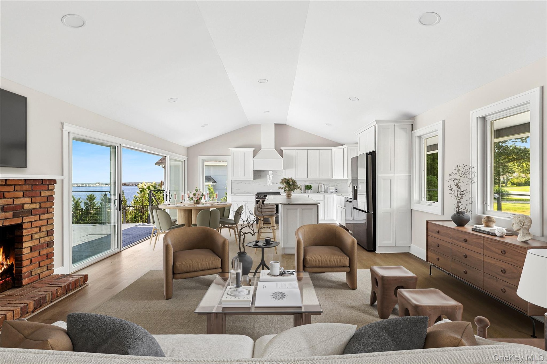 - Unfurnished living room with a brick fireplace, wood finished floors, a water view, and lofted ceiling