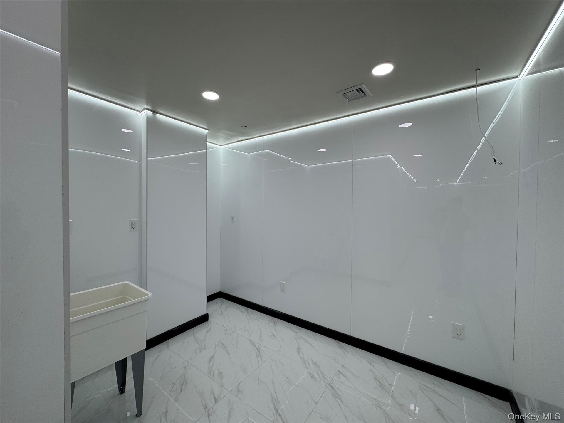 - Empty room with marble finish floor, visible vents, and recessed lighting