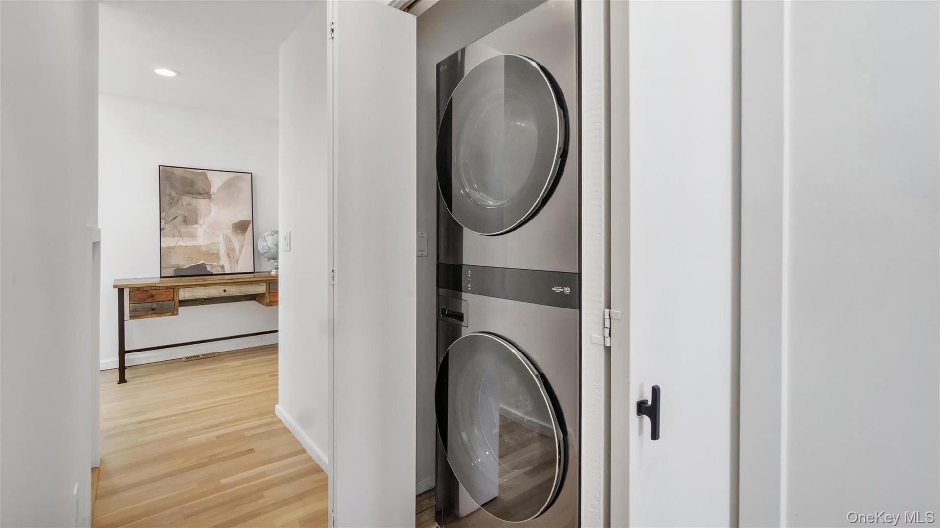 - Washroom with stacked washer / drying machine, wood finished floors, and laundry area