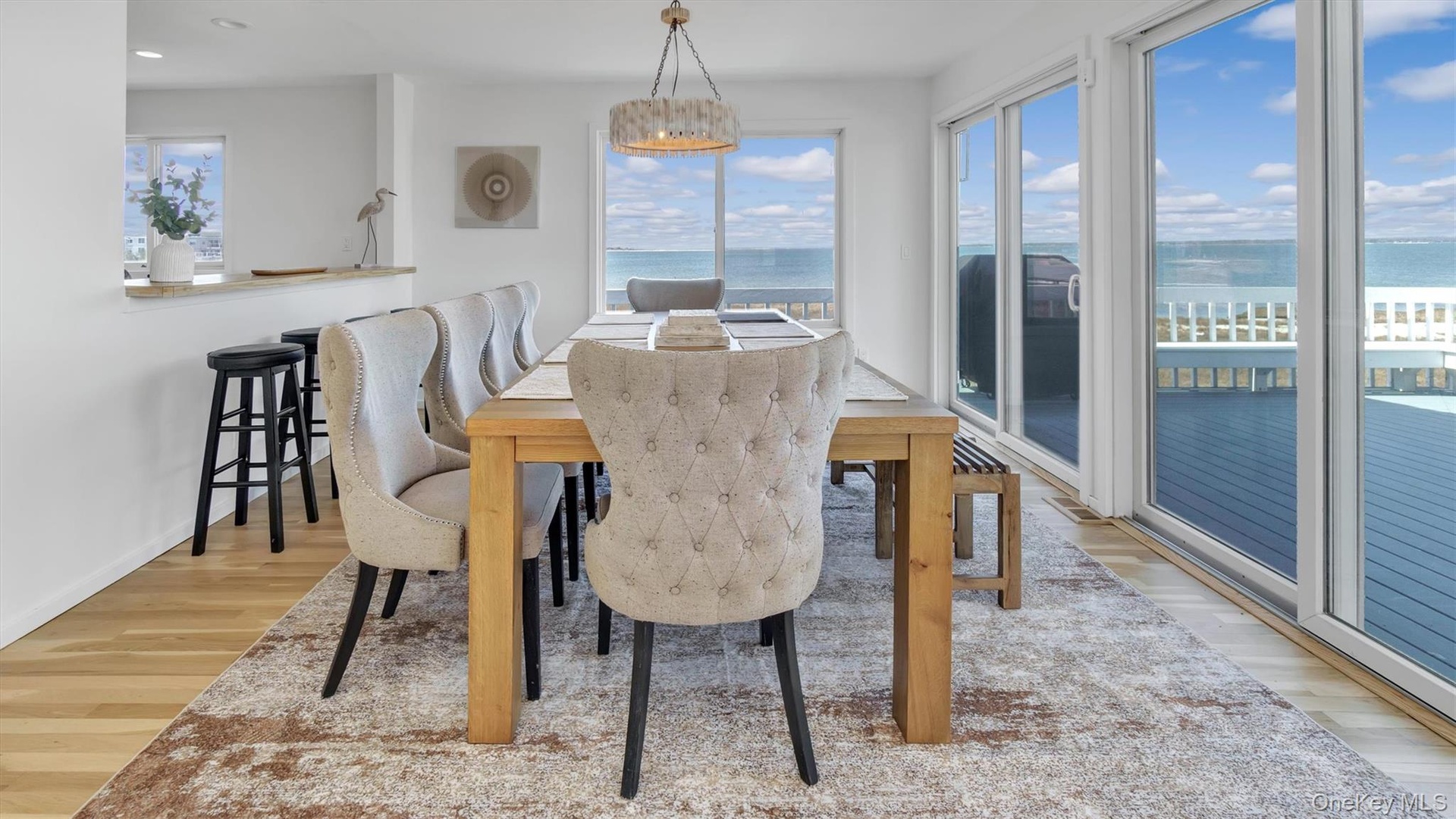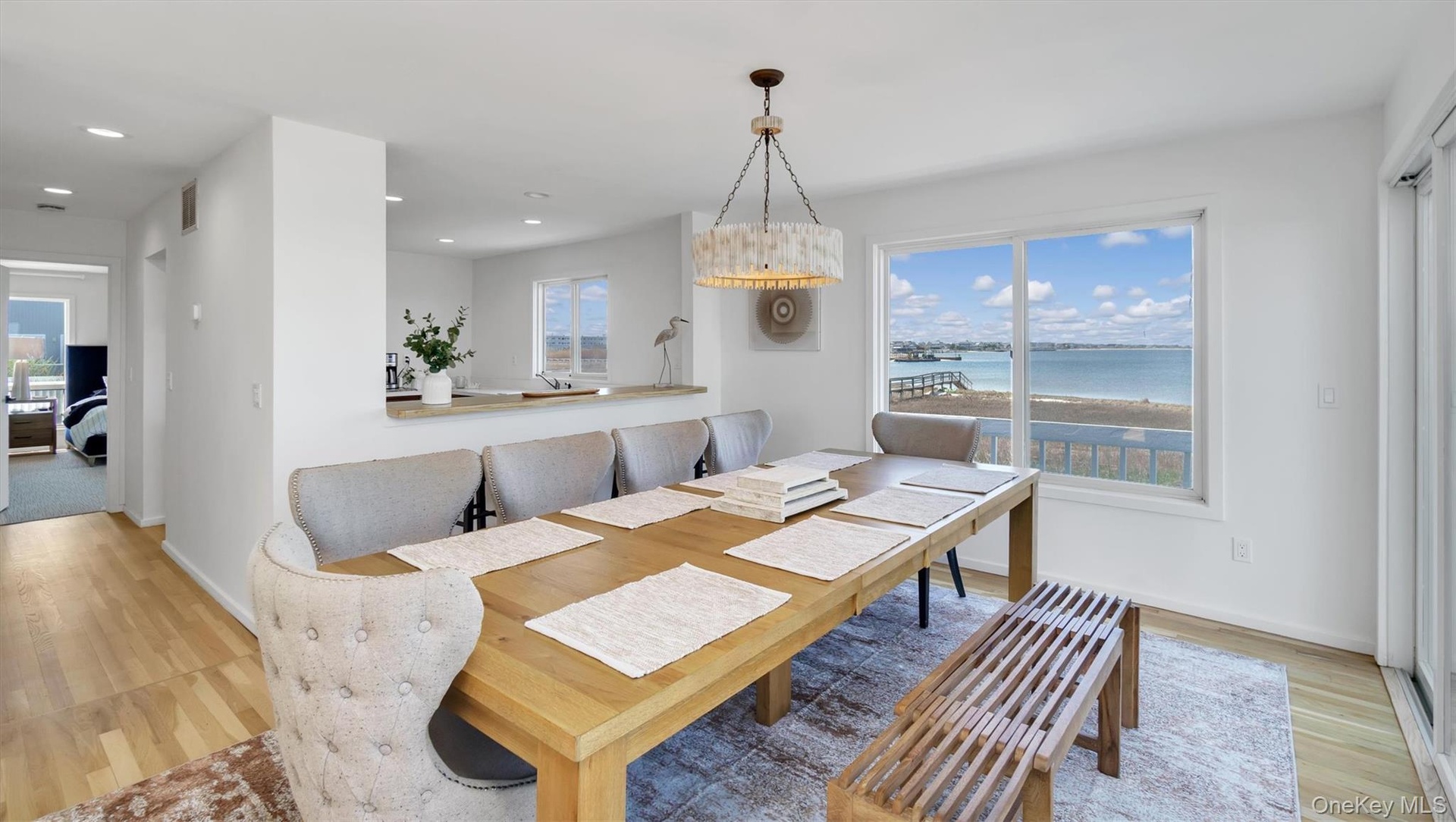 - Dining room with recessed lighting, a water view, wood finished floors, and a healthy amount of sunlight