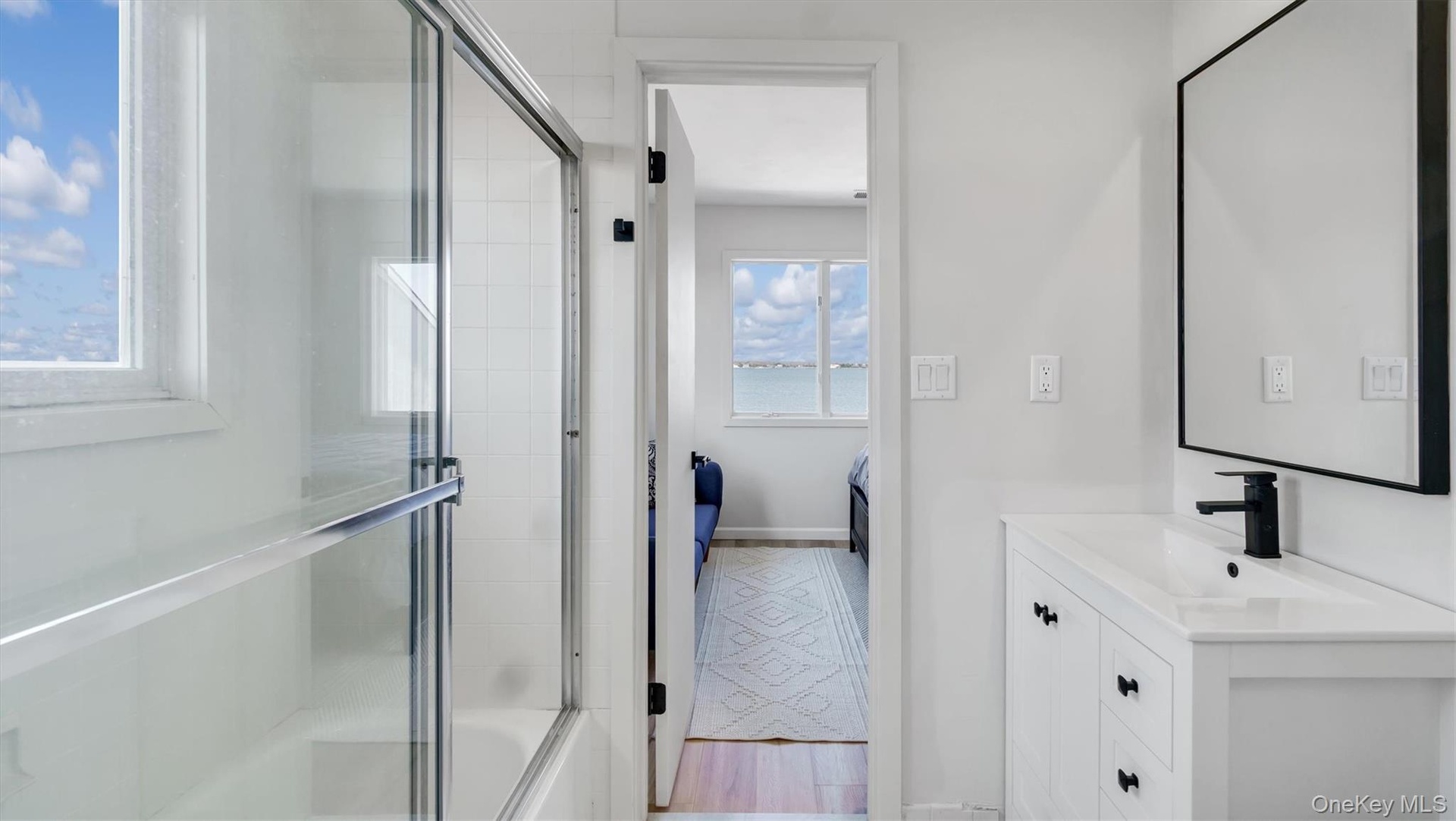 - Shared Bathroom with combined bath / shower with glass door, vanity, and ensuite bathroom