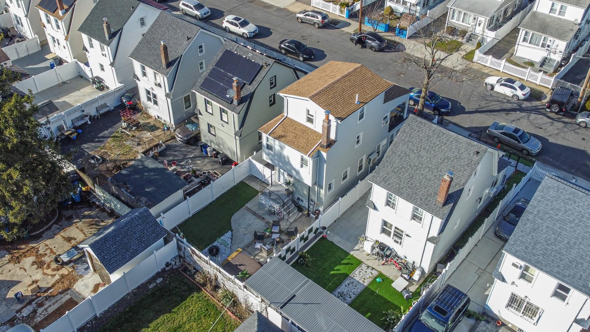 - View of front of home featuring a residential view, a gate, a fenced front yard, and solar panels