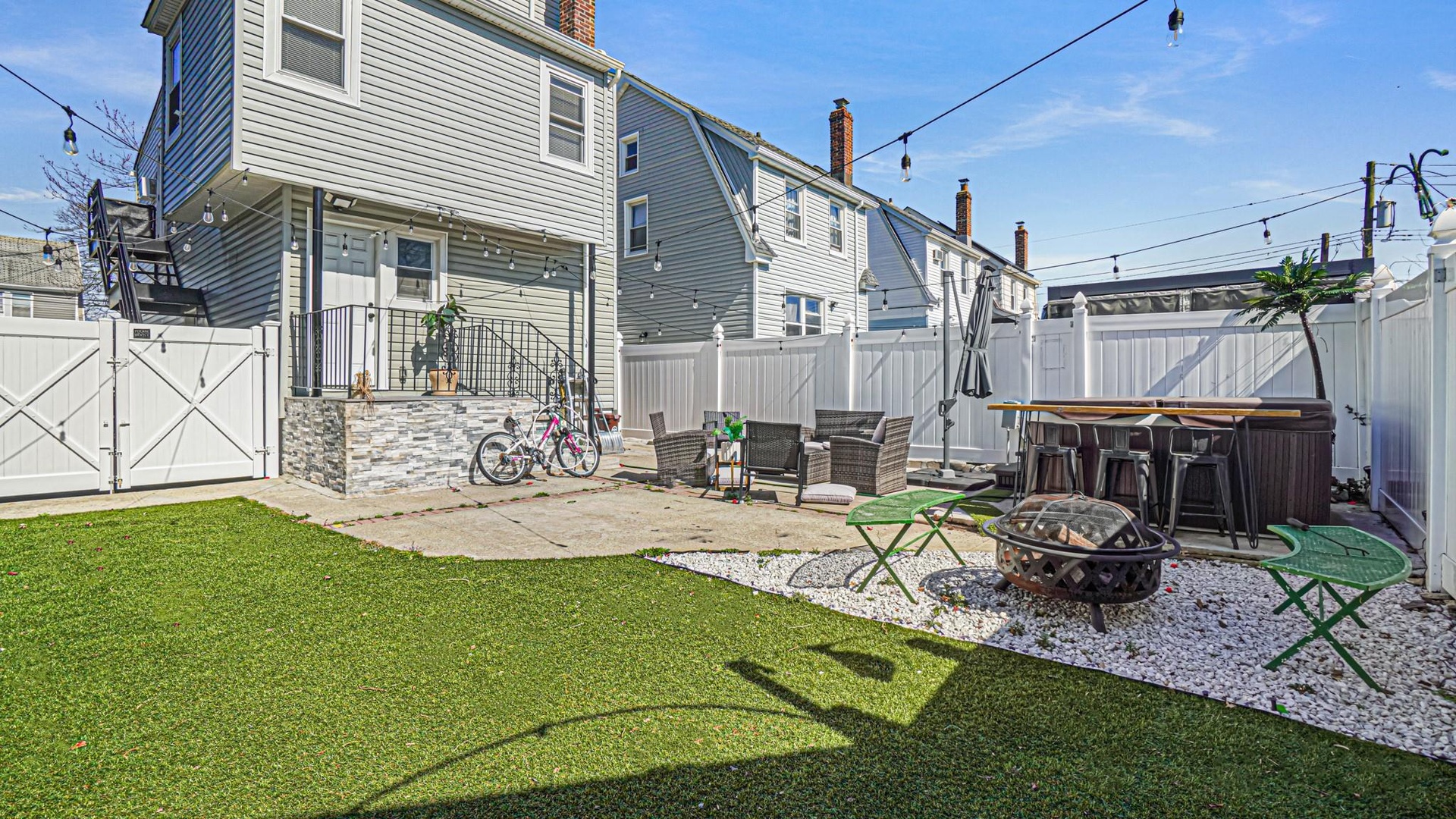 - Back of property featuring a gate, a patio, an outdoor fire pit, a fenced backyard, and a lawn