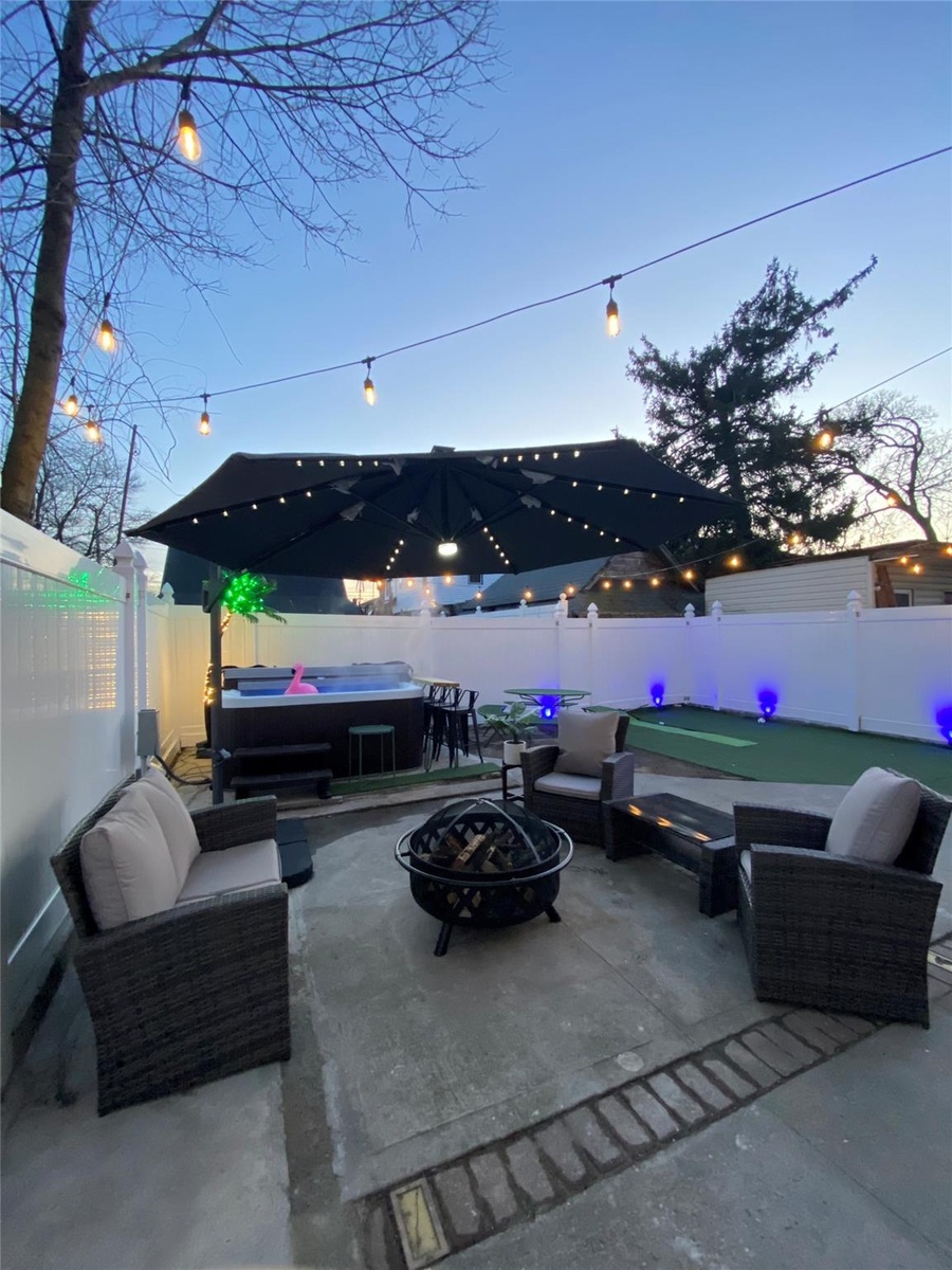 - View of patio featuring a fenced backyard, a fire pit, and a hot tub