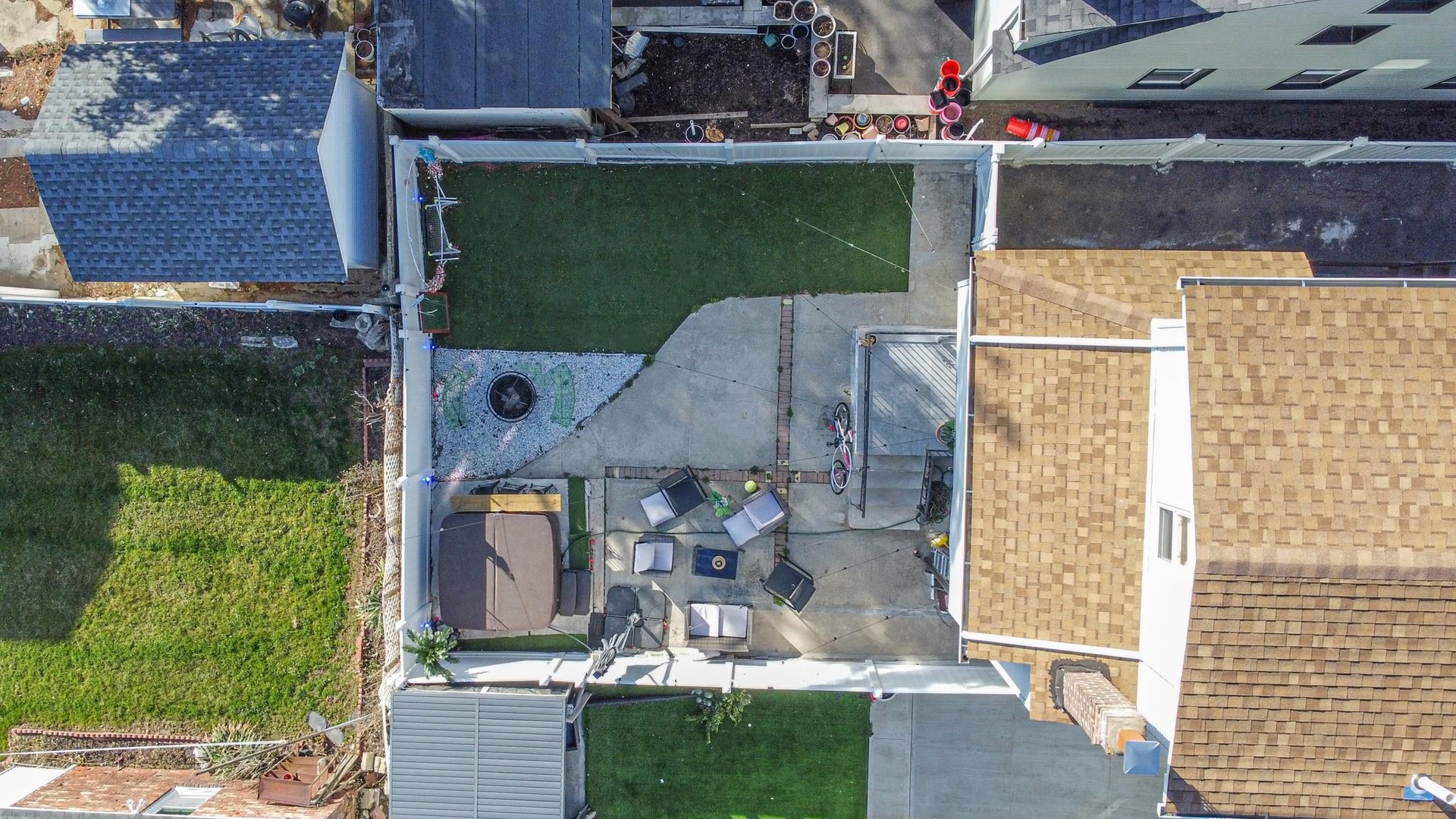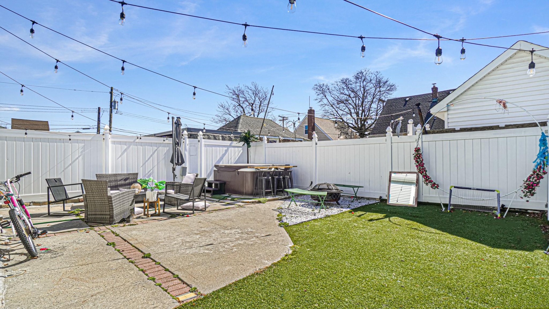 - View of yard featuring a fenced backyard, a patio area, a hot tub, and an outdoor living space with a fire pit